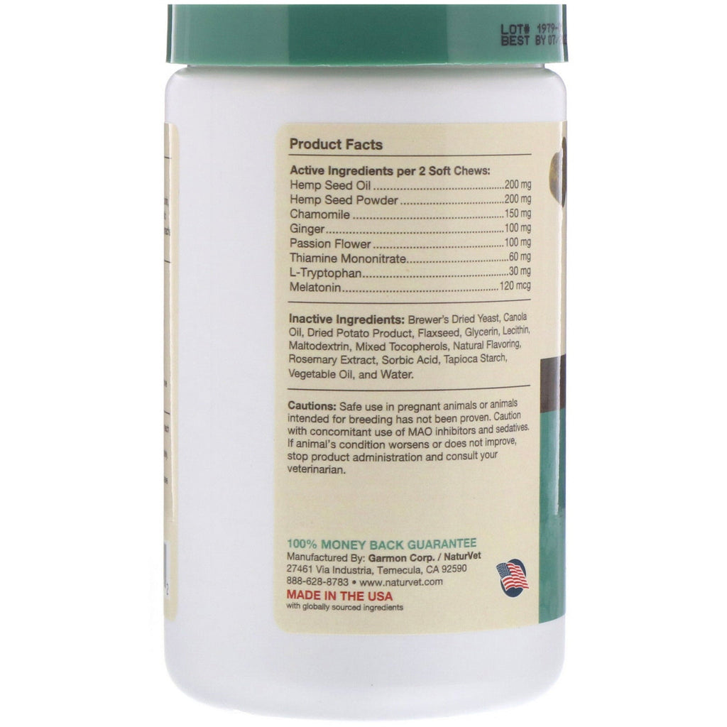 Wheat Free Quality Products For Over 20 Years Melatonin Ginger Quality Seal - NASC Hemp Health Benefits: Mood Activity Behavior Immune Memory Allergies Discomfort Calming Aid helps reduce stress and tension. Great for storms, fireworks, travel, and grooming. Veterinarian formulated Calming Aid with Chamomile, Thiamine, L-Tryptophan, Melatonin, and Hemp Seed. To complete this synergistic blend is Ginger to help support sensitive stomachs which is especially helpful while traveling.Sugg. UseFor use in dogs over the age of 12 weeks. Give recommended amount 30 minutes prior to stressful situation. Do not exceed double the above amount in a 12-hour period. Direction For  Use Weight Amount Up to 26 lbs. 1 soft chew 27 to 50 lbs. 2 soft chews 51 to 99 lbs. 3 soft chews 100 lbs. and over 4 soft chewsOther IngredientsBrewer's dried yeast, canola oil, dried potato product, flaxseed, glycerin, lecithin, maltodextrin, mixed tocopherols, natural flavoring, rosemary extract, sorbic...