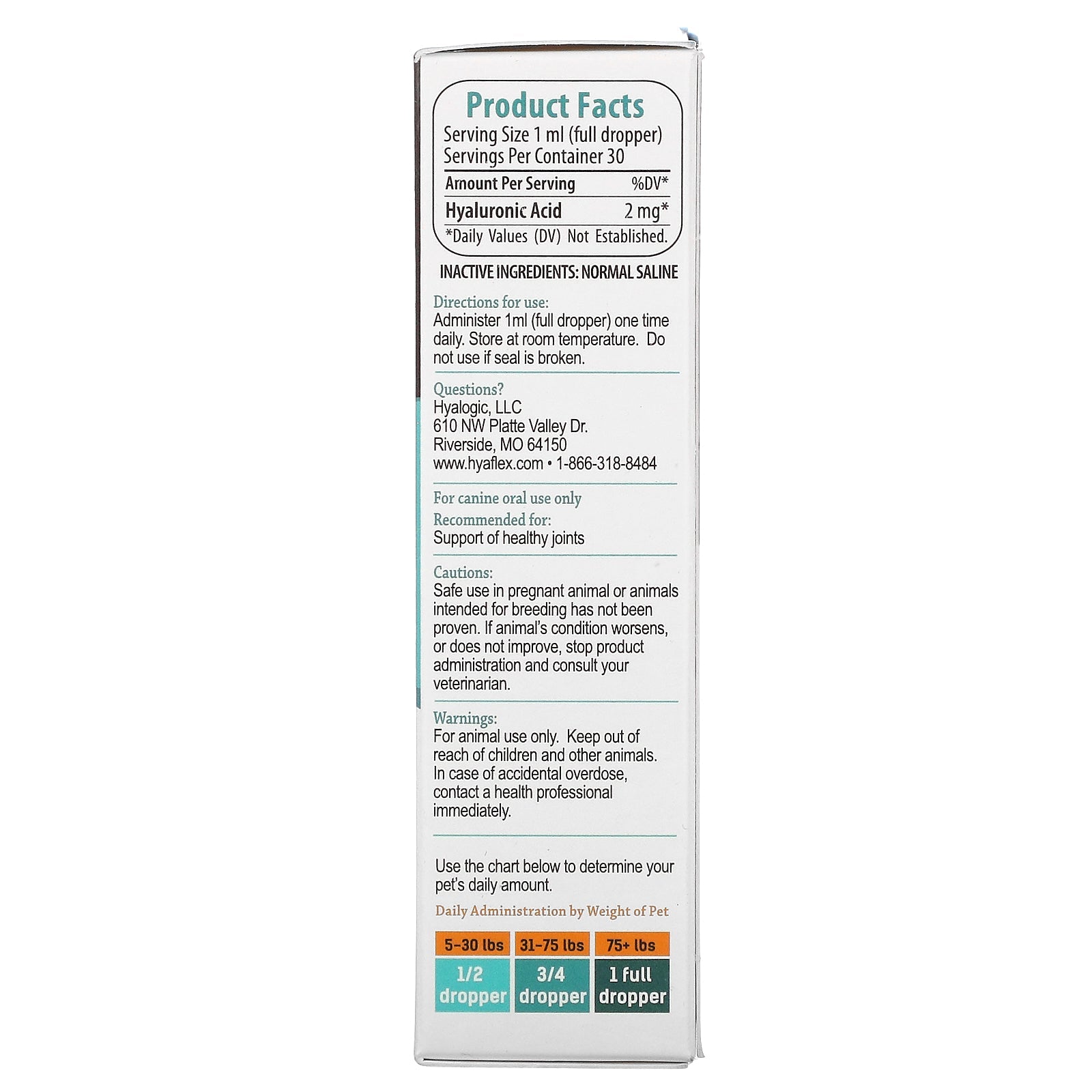 Non-Flavor Liquid For Dogs Oral Hyaluronic Acid (HA) Canine Hip & Joint Formula Supports Healthy Joints Quality Seal - NASC - National Animal Supplement Council Joint Health For Your Pet Hyaluronic Acid (HA) is revolutionizing the joint health management for humans, horses, and now your pets. Found naturally in all living organisms, it provides the elastic shock absorbing properties to support healthy joints for your pet. HyaFlex is patented for joint health, and helps in supporting your pet's ability to produce Hyaluronic Acid and maintaining healthy joint movement and lubrication. Benefits of HyaFlex Helps support and maintain Joint lubrication Joint flexibility Joint function Cartilage function Why choose HyaFlex for Dogs? Easy to use liquid form High molecular weight - supports healthy joints Convenient - only once per day Vegan friendly - non-animal derived Gluten freeSugg. UseAdminister 1 mL (full dropper) one time daily. Store at room temperature. Do not use...