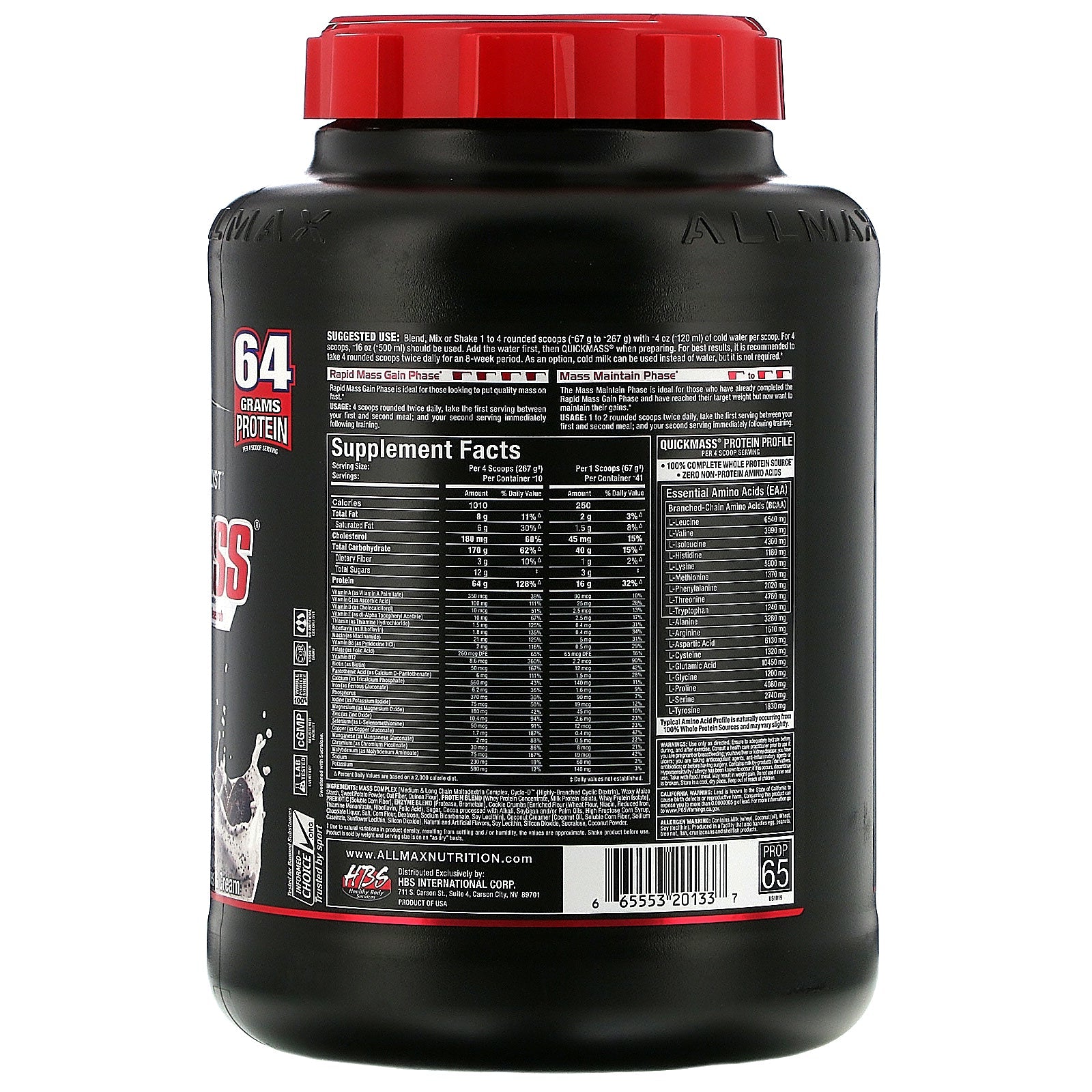 Amazing New Taste! 60 Grams Protein - Per 4 Scoop Serving Science - Innovation - Quality - Results AM - PM - Post Rapid Mass Gain Catalyst Based on Research at California State University Gain Lean Body Mass Fast 1010 Nutrient-Dense Calories Increase Calorie Activation Zero Sugars Added 3:1 Carb:Pro Dietary Supplement Informed Choice - Trusted by Sport Lab Tested - Every Ingredient Every Lot CGMP Registered Facility 100% Whole Protein Source Kosher Dairy No Artificial Color/Dye Natural & Artificial Flavors. Sweetened with Sucralose 3rd Party Tested - For Banned Substances Lean Mass Gains: Over 1,000 Calories Per Serving! 1010 Calories Per Serving University Research-Based Science For Maximum Mass: Quickmass packs 1010 Mass-Building Calories into every serving in cold water, no milk required! During one 8-week Gold-Standard (double-blind, placebo-controlled) study conducted at California State University, test subjects provided the same calorie content as 2 servings of Quickmass per day gained 4.5 times as much fat-free mass and increased chest size by 1 inch. Mass Pro MassPro creates a rapid and sustained delivery of muscle-building proteins that work continuously all day to help you recover and grow. Power up your muscle protein synthesis and fuel your Lean Mass Gains! Carb Plex Optimal 3:1 Carb to Protein Ratio: CarbPlex provides the calories your body needs to grow All Day with ultimate Mass Fuel for your gains! The Quickmass carbohydrate blend is powered by healthy, long-chain and complex carbohydrates such as sweet potato, rolled oats and quinoa along with scientifically studied and tested carbs like Cyclo-D and Vita Fiber, a natural pre-biotic. NP5 Technology Calorie Absorption Complex: Enhance your lean mass gains by absorbing nutrients better. Rapid gains in lean body mass depend on dramatic increases in calories and absorbing them! Patented Cinnulin PF, a natural extract of cinnamon, dramatically enhances the way your body absorbs calories. Along with natural extracts of Prickly Pear and Bitter Melon, Quickmass helps you absorb the highest quality nutrients effectively to turn calories into Mass. Unsurpassed AllMax Quality Guarantee Unsurpassed: The AllMax Quality Guarantee: Every ingredient added and every lot produced is laboratory-tested for purity and potency to ensure consistent product quality and integrity every time, guaranteed. QuickMass goes through the exclusive AllMax 5-Stage Quality Testing protocol. 3rd Party Tested - For Banned Substances Quickmass has been tested by an Independent, 3rd Party Laboratory for Banned Substances. Gain in Total Body Mass in 8 Weeks In a Gold-Standard 8-Week study performed at California State University, test subjects consuming the nutrient equivalent in 2 servings of QuickMass daily, gained an average of 6.8 lbs of Total Body Mass.