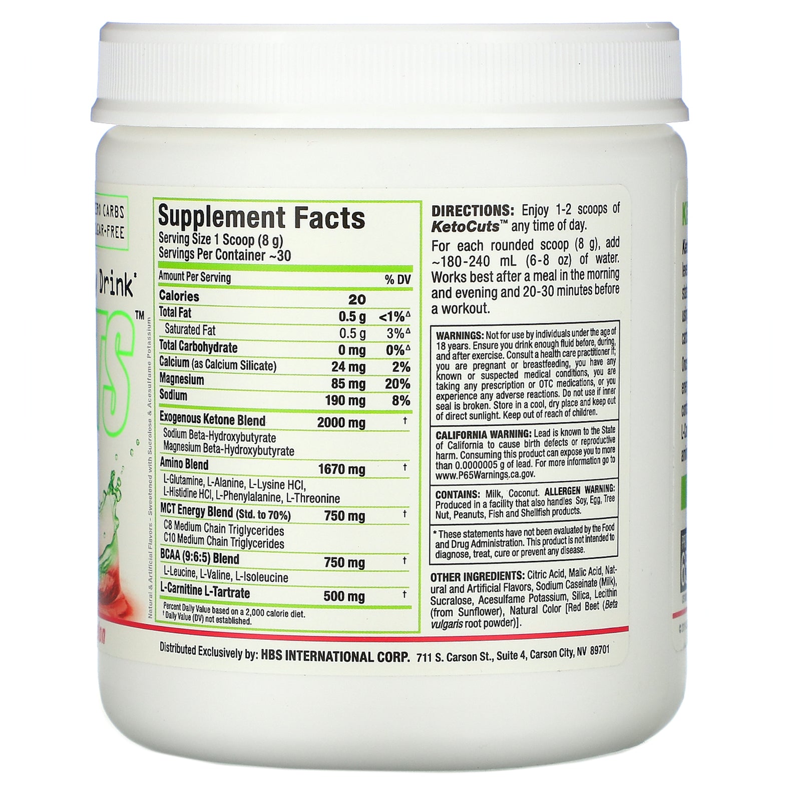 Stim Free Zero Carbs Sugar-Free BHBs, MCTs, Aminos, L-Carnitine Boosts Ketone Levels Natural Energy from C8 / C10 MCTs Supports Body Fat Reduction Dietary Supplement Natural & Artificial Flavors Sweetened with Sucralose & Acesulfame Potassium cGMP Registered Facility Tested Gluten Free Every Lot Lab Tested Clean Label Ketogenic Kickstarter KetoCuts™ is formulated with BHBs to increase ketone levels and boost energy. KetoCuts™ helps you achieve a state of ketosis that flips the switch in your body to start using fatty acids as the main source of energy instead of carbs. Once you've achieved ketosis, KetoCuts™ provides extra energy and improves cognitive function. KetoCuts™ also contains C8 and C10 MCTs as a natural energy source, L-Carnitine L-Tartrate to support body fat reduction, and amino acids for maintaining lean muscle gains.