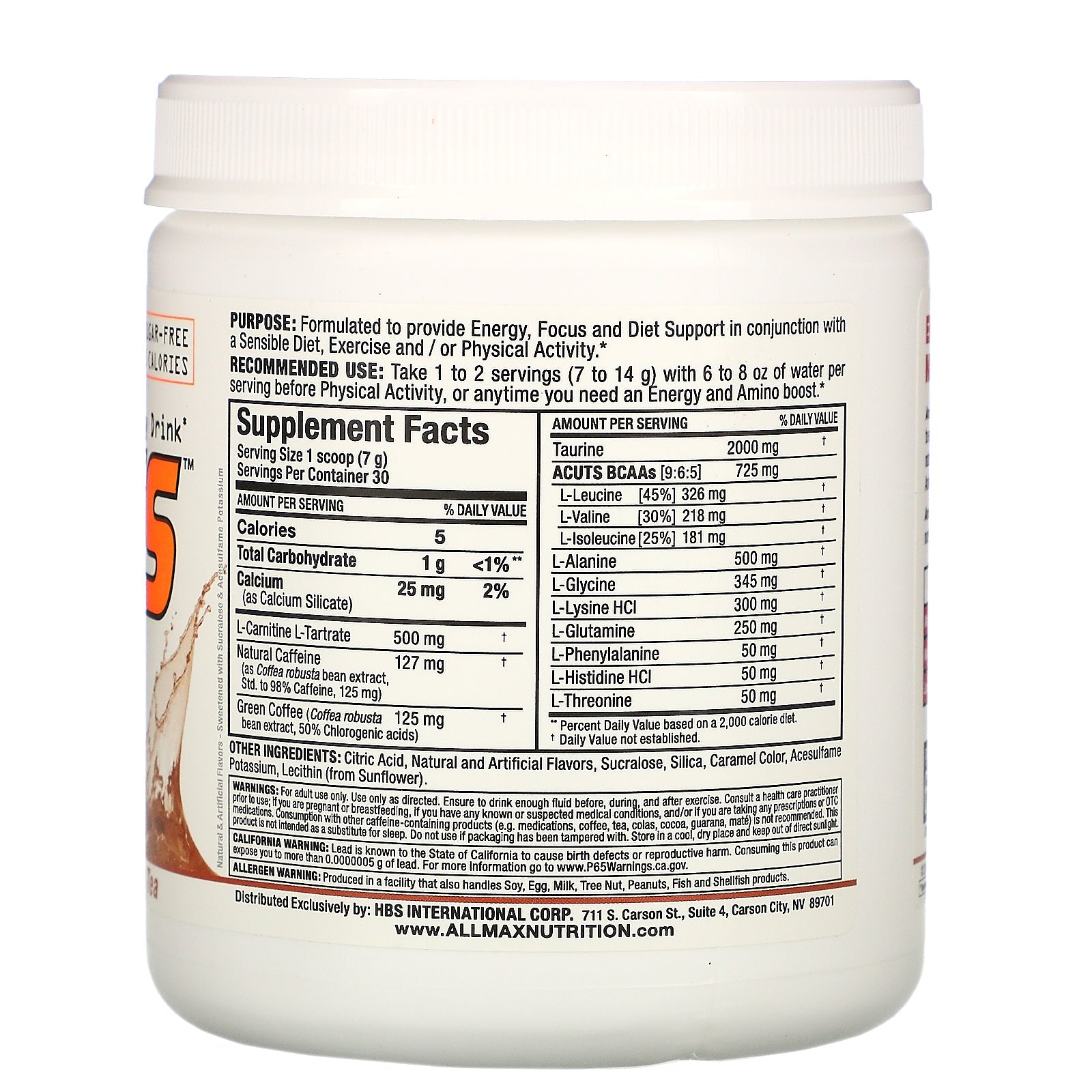 Serving Size: 1 scoop (7 g) Serving Per Container: 30 Amount Per Serving %Daily Value Calories 5 Total Carbohydrate 1 g <1%** Calcium (as Calcium Silicate) 25 mg 2% L-Carnitine L-Tartrate 500 mg † Natural Caffeine (as Coffea robusta bean extract, Std. to 98% Caffeine, 125 mg) 127 mg † Green Coffee (Coffea robusta bean extract, 50% Chlorogenic acids) 125 mg † Taurine 2000 mg † ACUTS BCAAs [9:6:5] 725 mg L-Leucine [45%] 326 mg † L-Valine [30%] 218 mg † L-Isoleucine [25%] 181 mg † L-Alanine 500 mg † L-Glycine 345 mg † L-Lysine HCI 300 mg † L-Glutamine 250 mg † L-Phenylalanine 50 mg † L-Histidine HCI 50 mg † L-Threonine 50 mg † **Percent Daily Value based on a 2,000 calorie diet. † Daily Value not established.Disclaimer