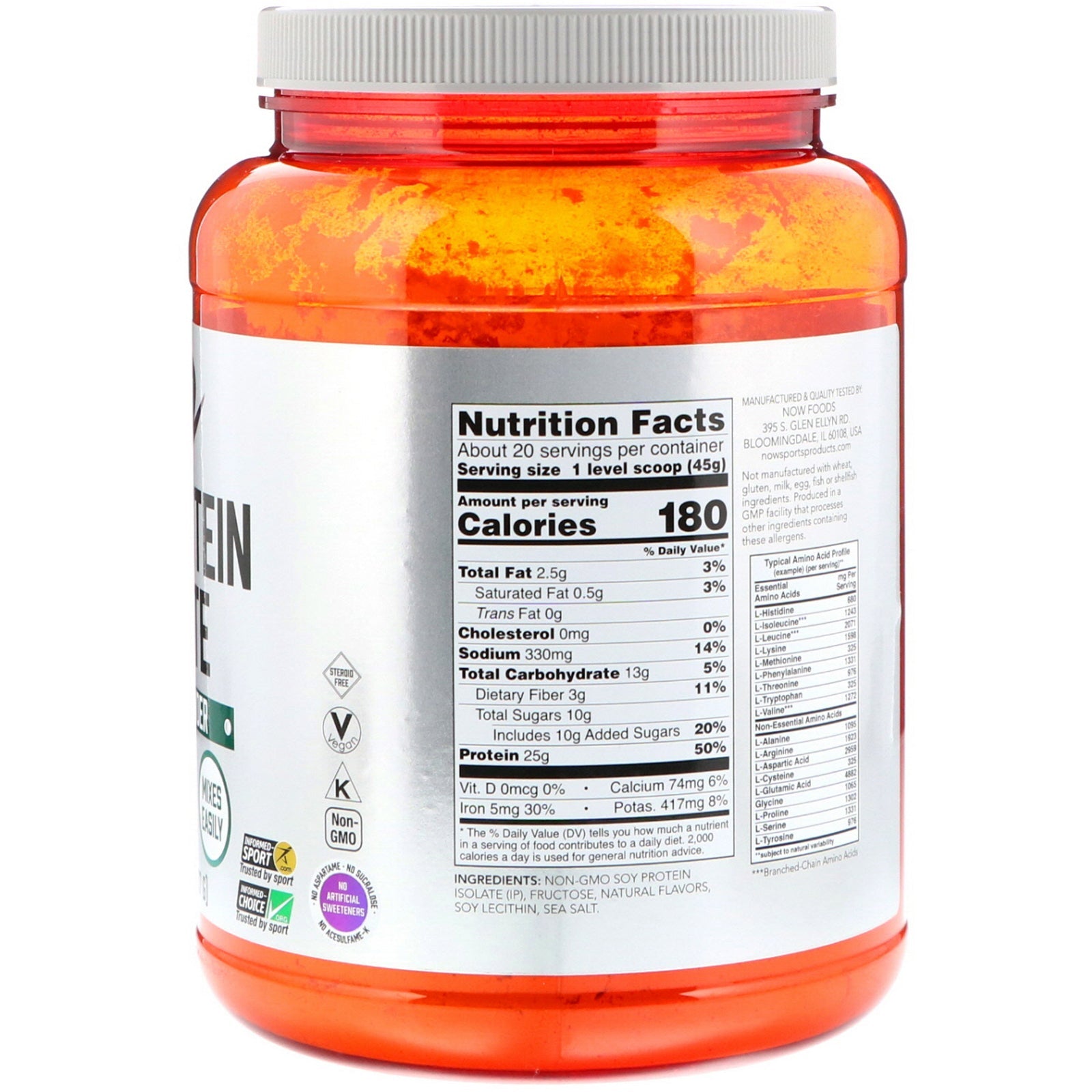 With BCAAs 25 g Protein Mixes Easily Informed-Sport.Com - Trusted by Sport Informed-Choice.Org - Trusted by Sport Steroid Free Vegan Kosher Non-GMO No Aspartame - No Sucralose- No Artificial Sweetener - No Acesulfame-K GMP Quality Assured NOW Sports Soy Protein Isolate is a good vegetable source of high quality complete protein that has an excellent amino acid profile. Each 1 scoop serving typically has over 4,500 mg or branched-chain amino acids (BCAAs). Soy products, including soy protein, have naturally occurring phytoestrogens and beneficial proteins such as genistein and daidzein. Make sure you're getting the basic building blocks of good health with high quality NOW Sports Soy Protein Isolate. Diets low in saturated fat and cholesterol that include 25 grams of soy protein a day may reduce the risk of heart disease. One serving of NOW Sports Soy Protein Isolate Powder provides 25 grams of soy protein.Sugg. UseAdd 1 level scoop...