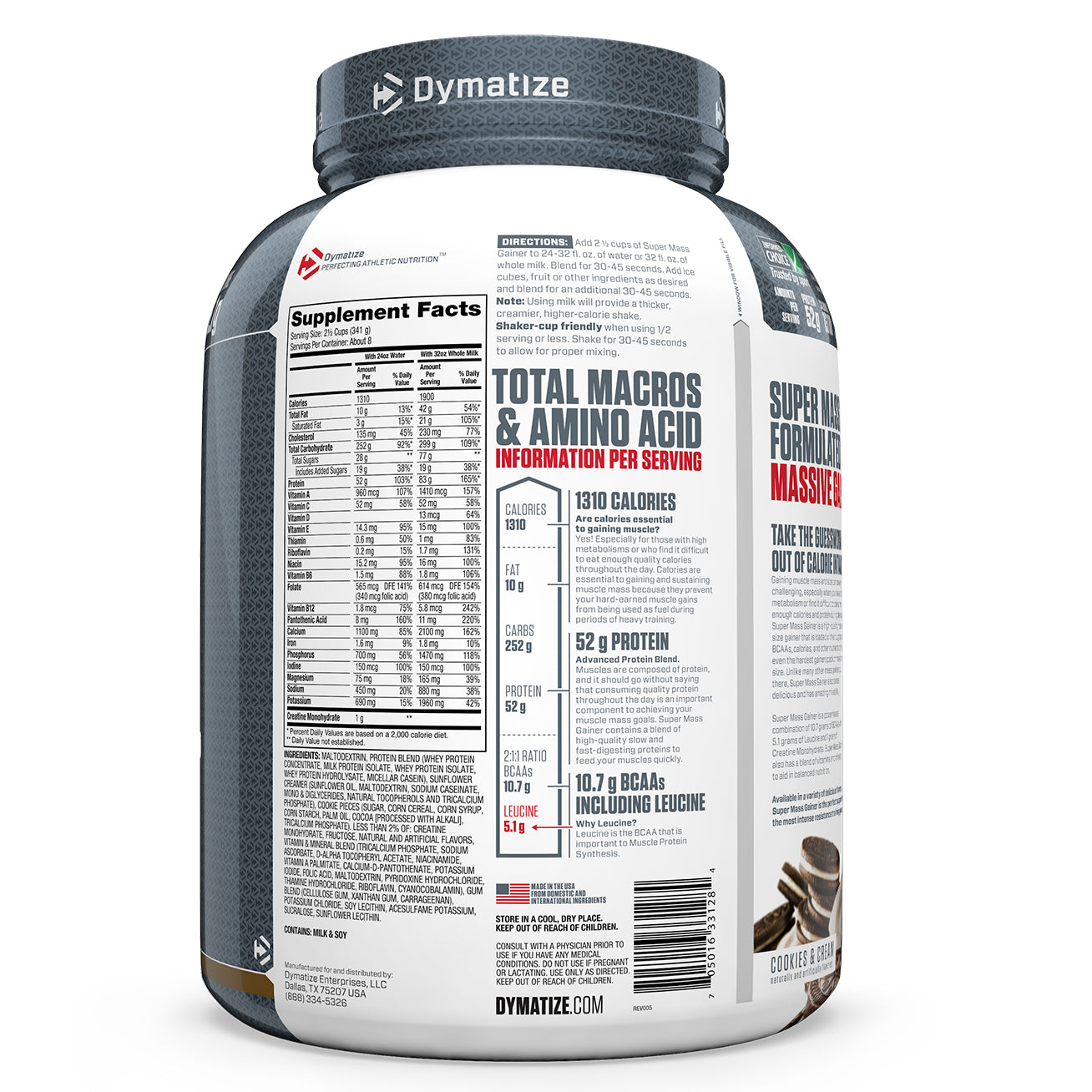 Calories 1310 Protein 52 g BCAAs 10.9 g Leucine 5.2 g High Protein + Carb Blend Dietary Supplement 8 Servings Banned Substance Tested + Gluten Free Natural and Artificially Flavored Dymatize Perfecting Athletic Nutrition Get Dymatized Total Macros & Amino Acid Information Per Serving Calories 1310 - 1310 Calories Are calories essential to gaining muscle? Yes! Especially for those with high metabolisms or who find it difficult to eat enough quality calories throughout the day. Calories are essential to gaining and sustaining muscle mass because they prevent your hard-earned muscle gains from being used as fuel during periods of heavy training. Carbs 253 g Protein 52 g - 52 g Protein Advanced Protein Blend. Muscle are composed of protein, and it should go without saying that consuming quality protein throughout the day is an important component to achieving your muscle mass goals. Super Mass Gainer contains a blend of high-quality...