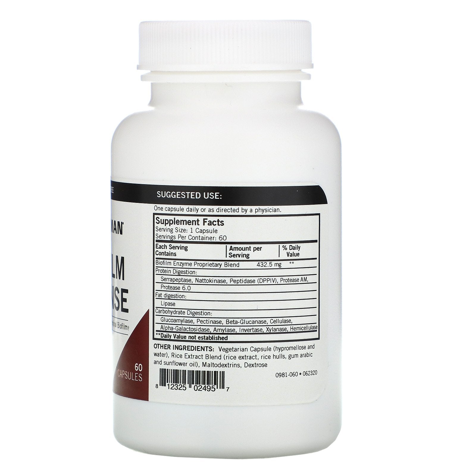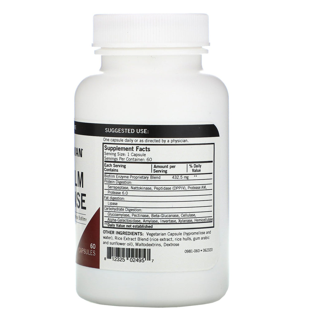 Ultra Tested Consistent Good Manufacturing Practices - Consistent Quality Gluten-Free Supports Digestion of Intestinal Biofilm Dietary SupplementSugg. UseOne capsule daily or as directed by a physician.Other IngredientsVegetarian capsule (hypromellose and water), rice extract blend (rice extract, rice hulls, gum arabic and sunflower oil), maltodextrins, dextrose. Allergen Warning: Contains sulphites, enzymes grown on fermentation media containing wheat and soy (may contain undetectable trace amounts). Free of: Milk, eggs, fish, shellfish, tree nuts, peanuts, wheat or soy.Supplement FactsServing Size: 1 capsule Serving Per Container: 60 Each Serving Contains Amount Per Serving % Daily Value Biofilm Enzyme Proprietary Blend 432.5 mg ** Protein Digestion: Serrapeptase, Nattokinase, Peptidase (DPPIV), Protease AM, Protease 6.0 Fat digestion: Lipase Carbohydrate Digestion: Glucoamylase, Pectinase, Beta-Glucanase, Cellulase, Alpha-Galactosidase, Amylase, Invertase, Xylanase, Hemicellulase **Daily Values not established.DisclaimerWhile VitaminsUK strives to ensure the accuracy of its product images and information, some manufacturing changes to packaging and/or ingredients may be pending update...