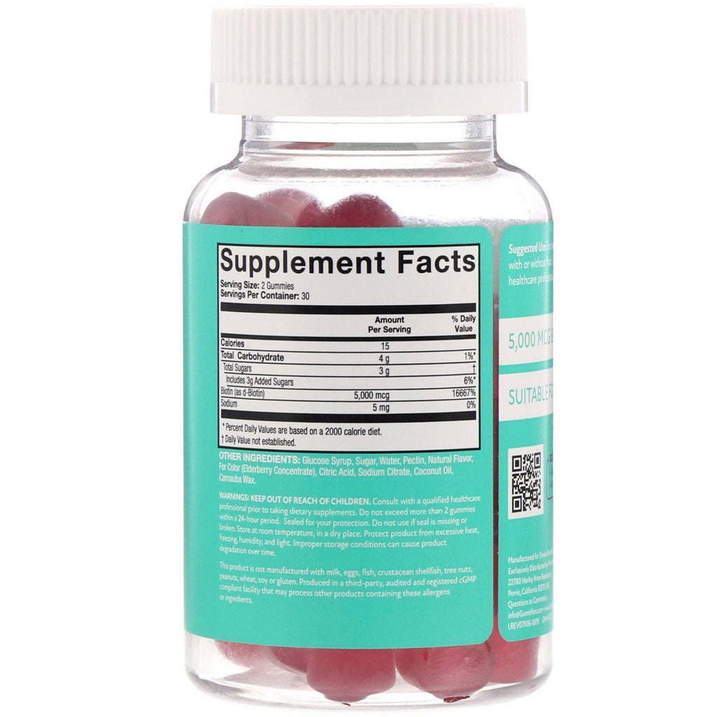 Dietary Supplement 5,000 mcg Biotin Suitable for VegetariansSugg. UseFor healthy adults, chew 2 gummies daily, with or without food, or as directed by a qualified healthcare professional.Other IngredientsGlucose syrup, sugar, water, pectin, natural flavor, for color (elderberry concentrate), citric acid, sodium citrate, coconut oil, carnauba wax. Does not contain: Gelatin, gluten, gmos or soy, artificial colors, flavors or sweeteners. This product is not manufactured with milk, eggs,fish, crustacean shellfish, tree nuts, peanuts, wheat, soy or gluten. Produced in a third-party, audited and registered cGMP compliant facility that may process other products containing these allergens or ingredients.Supplement FactsServing Size: 2 Gummies Serving Per Container: 30 Amount Per Serving %Daily Value Calories 15 Total Carbohydrate 4 g 1%* Total Sugars 3 g † Includes 3 g Added Sugars 6%* Biotin (as d-Biotin) 5,000 mcg 16667% Sodium 5 mg 0% *Percent Daily Values are based on a 2,000 calorie diet. †Daily Value not...