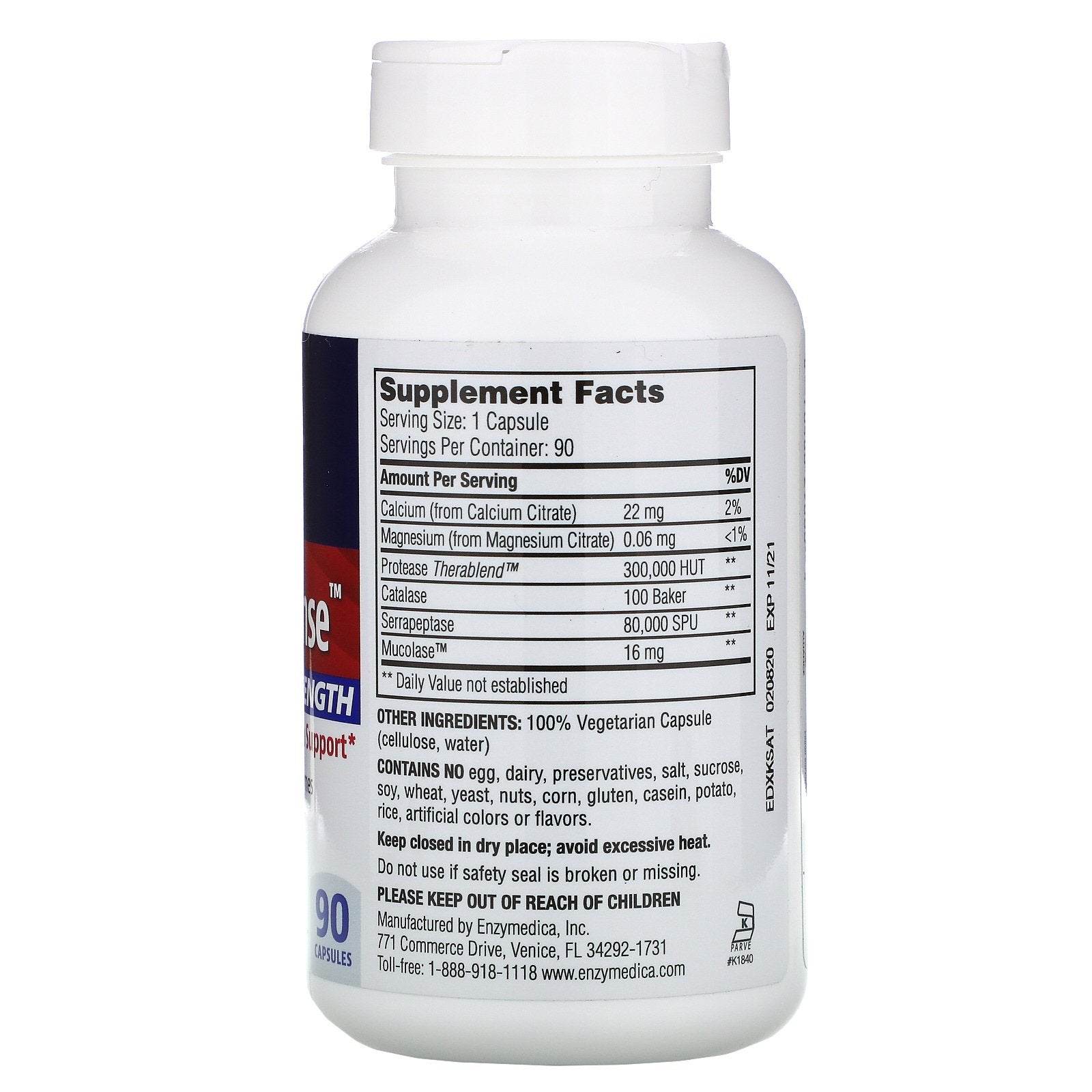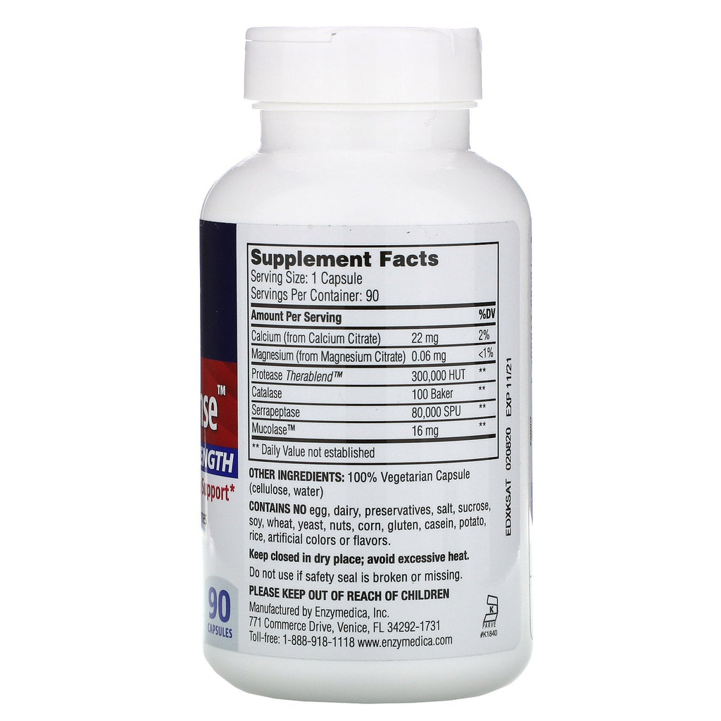 Serving Size: 1 Capsule Servings Per Container: 90 Amount Per Serving %DV† Calcium (from Calcium Citrate) 22 mg 2% Magnesium (from Magnesium Citrate) 0.1 mg <1% Protease Thera-blend 300,000 HUT ** Catalase 100 Baker ** Serrapeptase 80,000 SPU ** Mucolase 16 mg ** ** Daily Value not established. † Percent Daily Values are based on a 2,000 calorie diet.Disclaimer