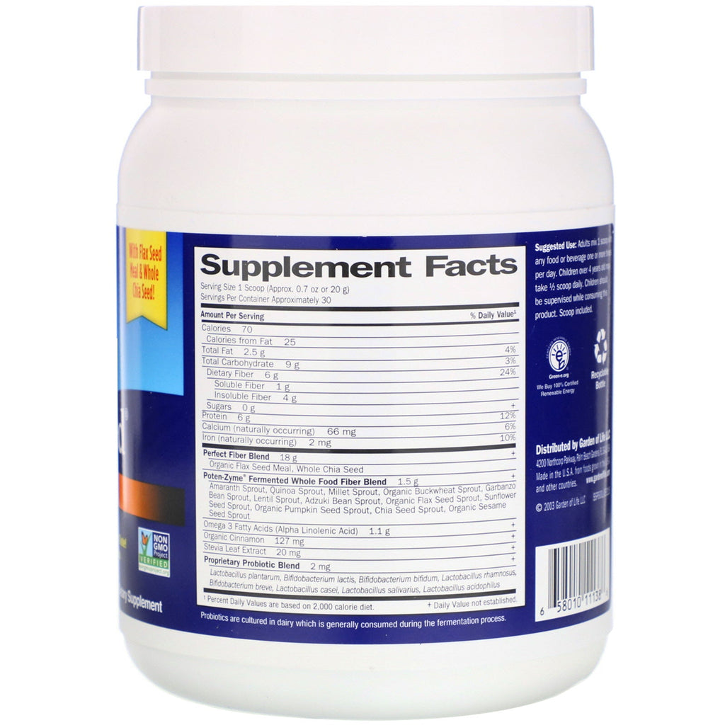 Serving Size: 1 Scoop (Approx. 0.7 oz or 20 g) Servings Per Container: Approximately 30 Amount Per Serving % Daily Value¹ Calories 70 Calories from Fat 25 Total Fat 2.5 g 3% Total Carbohydrate 9 g 3% Dietary Fiber 6 g 24% Soluble Fiber 1 g Insoluble Fiber 4 g Sugars 0 g + Protein 6 g 12% Calcium (naturally occurring) 66 mg 6% Iron (naturally occurring) 2 mg 10% Perfect Fiber Blend 18 g + Organic Flax Seed Meal, Whole Chia Seed Poten-Zyme Fermented Whole Food Fiber Blend 1.5 g + Amaranth Sprout, Quinoa Sprout, Millet Sprout, Organic Buckwheat Sprout, Garbanzo Bean Sprout, Lentil Sprout, Adzuki Bean Sprout, Organic Flax Seed Sprout, Sunflower Seed Sprout, Organic Pumpkin Seed Sprout, Chia Seed Sprout, Organic Sesame Seed Sprout Omega 3 Fatty Acids (Alpha Linolenic Acid) 1.1 g + Organic Cinnamon 127 mg + Stevia Leaf Extract 20 mg + Proprietary Probiotic Blend 2 mg + Lactobacillus plantarum, Bifidobacterium lactis, Bifidobacterium bifidum, Lactobacillus rhamnosus, Bifidobacterium breve, Lactobacillus casei, Lactobacillus salivarius, Lactobacillus acidophilus ¹Percent Daily Values are based on 2,000 calorie diet. +Daily Value not established.Disclaimer