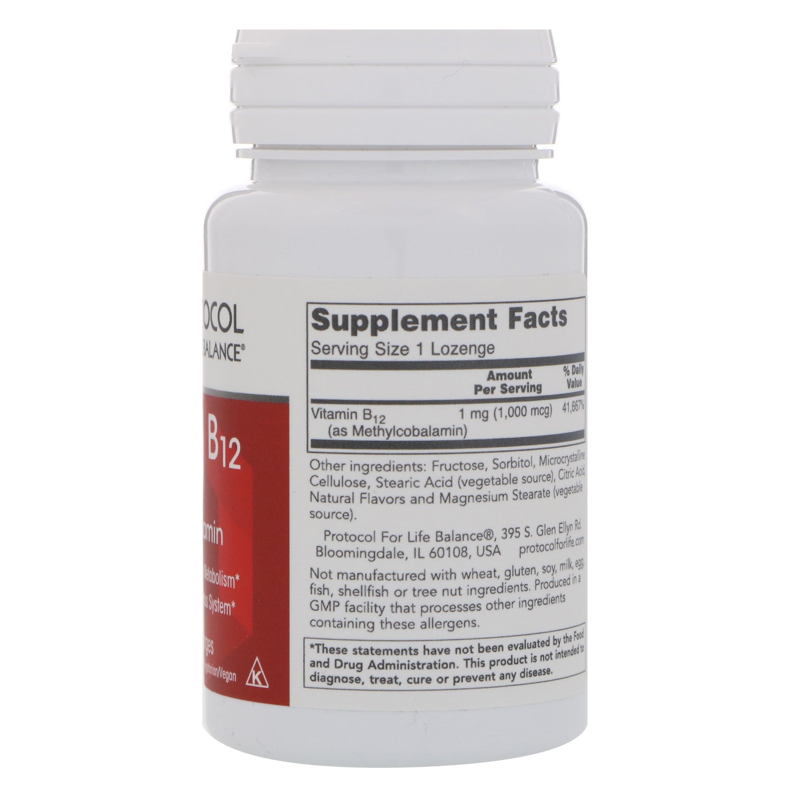 Healthy Homocysteine Metabolism Supports Healthy Nervous System A Dietary Supplement Vegetarian-Vegan Kosher How It Works: Vitamin B12 has the largest and most complex chemical structure of all the vitamins. Most of its functions are related to its co-enzyme activity, such as enzymes required for the production of DNA during cell division, as well as for the proper disposal of homocysteine. B12 is also necessary for the maintenance of a healthy nervous system.Sugg. UseTake 1 lozenge daily, or as directed by your healthcare practitioner. Chew lozenge or hold in mouth until dissolved and swallow.Other IngredientsFructose, sorbitol, microcrystalline cellulose, stearic acid (vegetable source), citric acid, natural flavors and magnesium stearate (vegetable source). Not manufactured with wheat, gluten, soy, milk, egg, fish, shellfish or tree nut ingredients. Produced in a GMP facility that processes other ingredients containing these allergens.Supplement FactsServing Size: 1 Lozenge Amount Per Serving %Daily Value Vitamin B12 (as Methylcobalamin) 1...