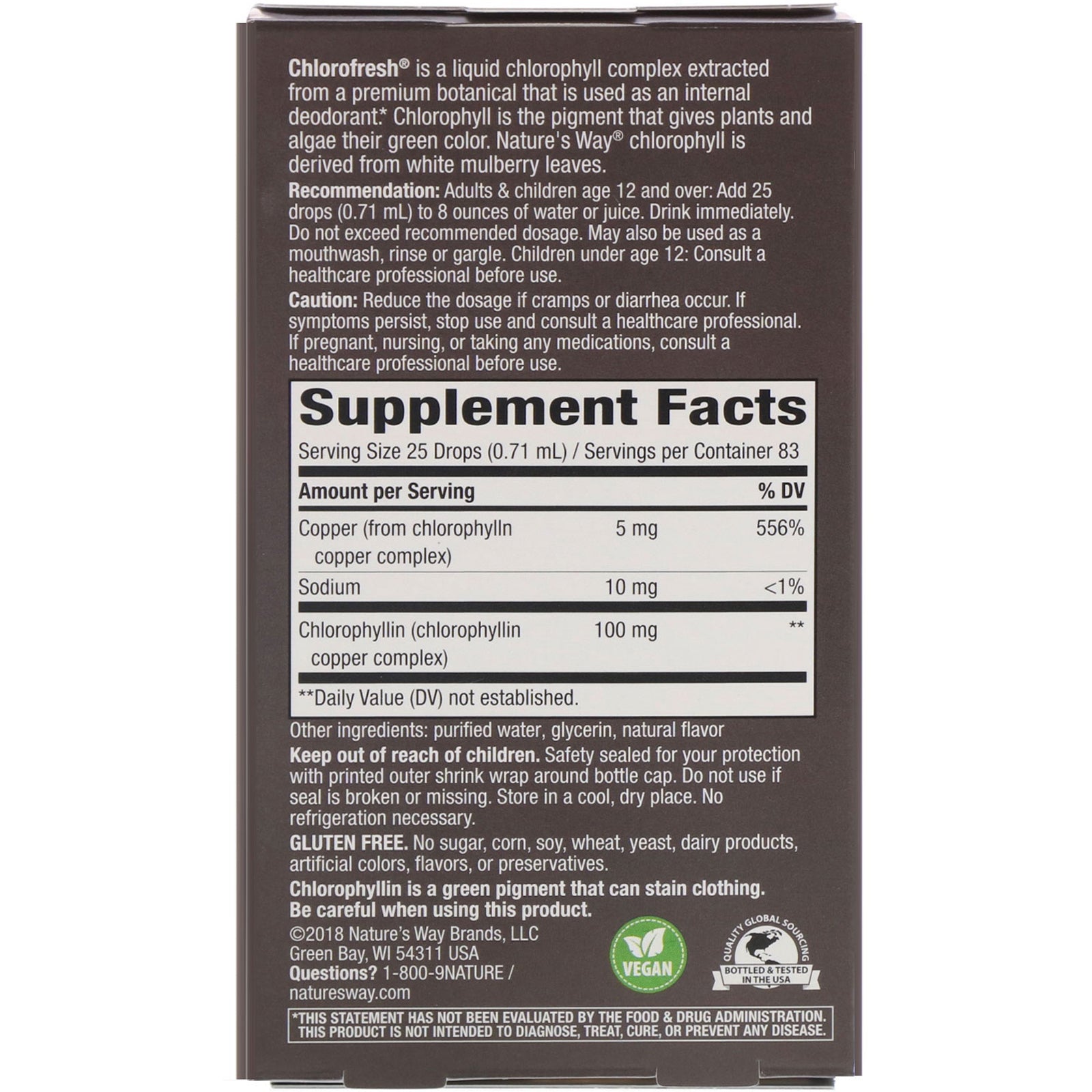 Since 1969 Internal Deodorant 100 mg Per Serving Dietary Supplement Chlorophyllin from Premium Botanicals Alcohol Free 25 Drops = 100 mg of Chlorophyllin No Refrigeration or Preservatives 40X More Chlorophyllin than Chlorofresh Original Formulas 83 Servings Per Bottle Vegan Quality Global Sourcing Bottled & Tested in the USA Chlorofresh® is a liquid chlorophyll complex extracted from a premium botanical that is used as an internal deodorant. Chlorophyll is the pigment that gives plants and algae their green color. Nature's Way® chlorophyll is derived from white mulberry leaves.Sugg. UseAdults & children age 12 and over: Add 25 drops (0.71 ml) to 8 ounces of water or juice. Drink immediately. Do not exceed recommended dosage. May also be used as a mouthwash, rinse or gargle. Children under age 12: Consult a healthcare professional before use.Other IngredientsPurified water, glycerin, natural flavor. Gluten Free. No sugar, corn, soy, wheat, yeast, dairy products, artificial colors,...