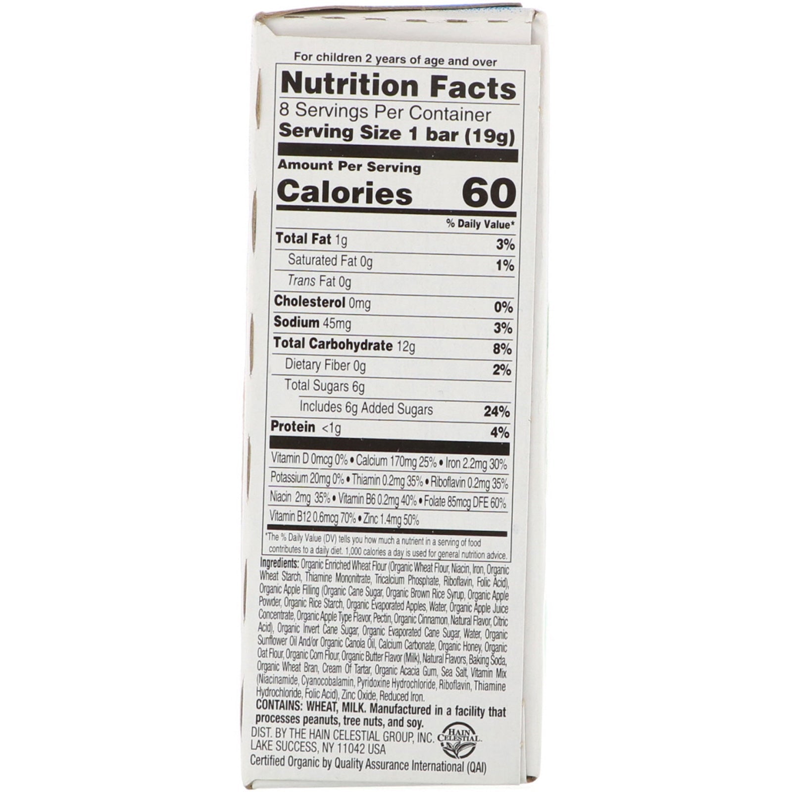 Økologisk beriget hvedemel (organisk hvedemel, niacin, jern, organisk hvedestivelse, thiaminmononitrat, tricalciumphosphat, riboflavin, folinsyre), organisk æblefyld (organisk rørsukker, organisk brun rissirup, organisk æblepulver, organisk risstivelse, organiske inddampede æbler, vand, organisk æblejuicekoncentrat, organisk æblearoma, organisk kanel, naturlig smag, citronsyre), organisk invertrørsukker, organisk fordampet rørsukker, vand, organisk solsikkeolie og/eller organisk rapsolie, calciumcarbonat , økologisk honning, økologisk havremel, økologisk majsmel, økologisk smørsmag (mælk), naturlige smagsstoffer, natron, økologisk hvedeklid, fløde af tandsten, økologisk akaciegummi, havsalt, vitaminblanding (niacinamid, cyanocobalamin, pyridoxinhydrochlorid, riboflavin, thiaminhydrochlorid, cyanocobalamin, pyridoxinhydrochlorid, riboflavin, thiaminhydrochlorid, folinsyre), zinkoxid, reduceret jern. Indeholder: Hvede, mælk. Fremstillet i et anlæg, der behandler jordnødder, trænødder og soja. Supplerende Fakta
