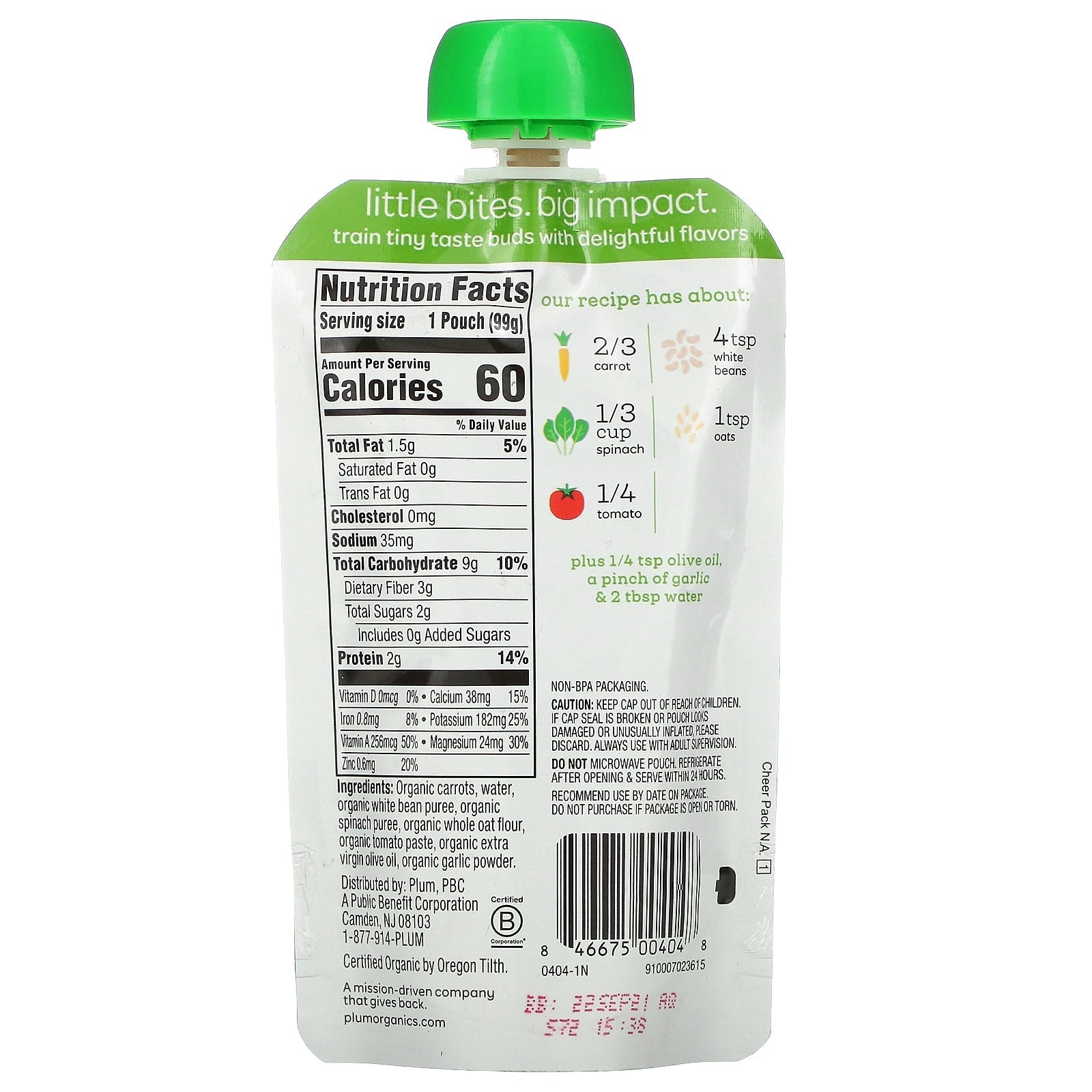 6 måneder og derover USDA Non GMO Project Verified Clear Bottom Pouch Certificeret af Oregon Tilth Non-BPA Packaging Certified B Corporation Little Bites. Stor indflydelse. Træn små smagsløg med dejlige smagsoplevelser. Vores opskrift har ca.: 2/3 gulerod 1/3 kop spinat 1/4 tomat 4 tsk hvide bønner 1 tsk havre plus 1/4 tsk olivenolie, en knivspids hvidløg og 2 spsk vand Sugg. Brug Må ikke mikrobølgepose. Stil på køl efter åbning og server inden for 24 timer. Andre ingredienser gulerod, vand, hvidbønnepuré, spinatpuré, fuldkornshavremel, tomatpuré, ekstra jomfru olivenolie, hvidløgspulver. Supplerende Fakta Portionsstørrelse: 1 pose (99 g) Mængde pr. portion %Daglig værdi Kalorier 60 Fedt i alt 1,5 g 5 % Mættet fedt 0 g Transfedt 0 g Kolesterol 0 mg Natrium 35 mg Totalt kulhydrat 9 g 10 % Kostfibre 3 g Sukker i alt 2 g Inkluderer 0 g Tilsat sukkerarter Protein 2 g 14 % D-vitamin 0 mcg 0...