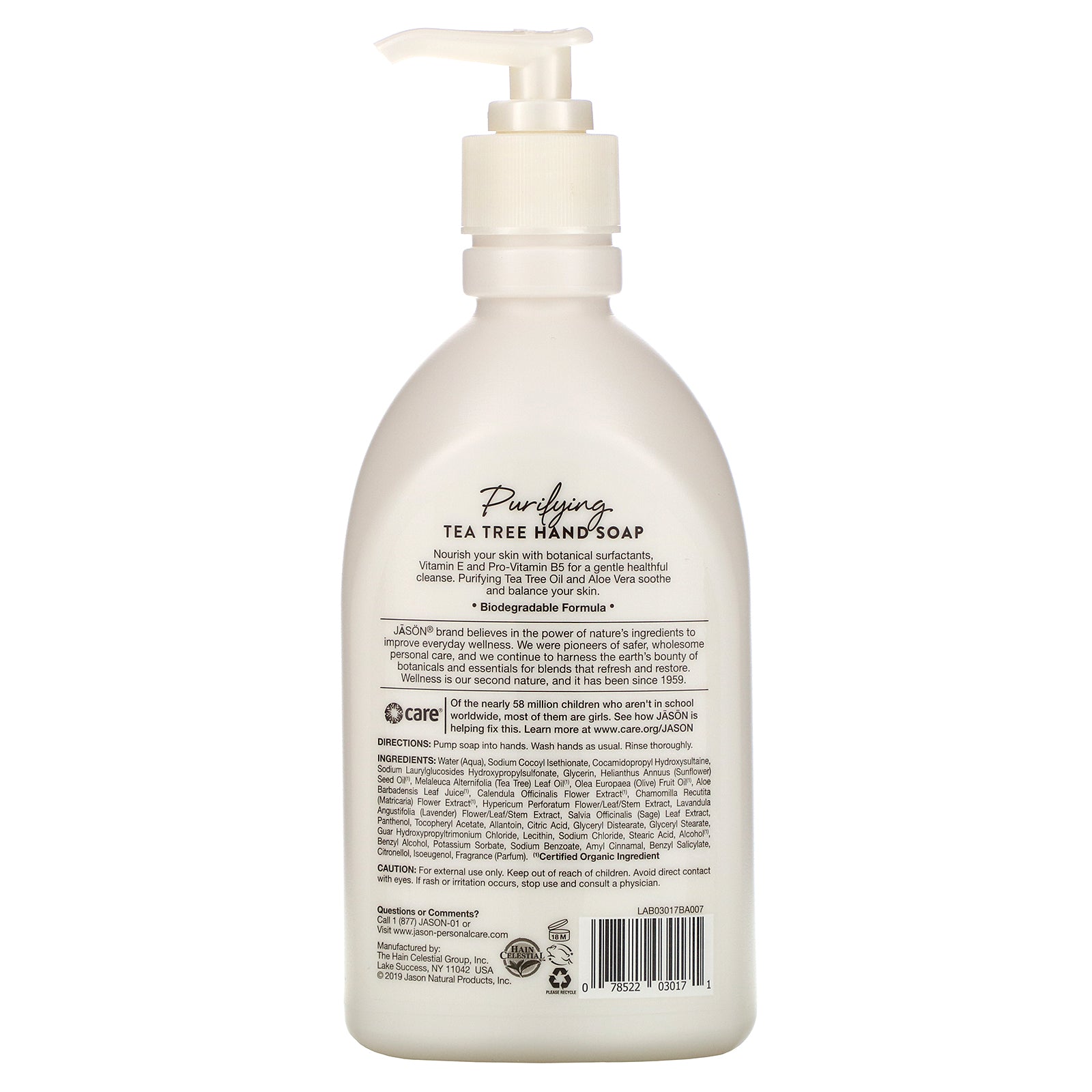 Siden 1959 Genopliver og nærer med Tea Tree Oil, Vitamin E & Pro-Vitamin B5 Ingen parabener, barske sulfater, vaselin, phthalater En jordvenlig, biologisk nedbrydelig formel Hain Celestial Cruelty-Free Leaping Bunny Certificeret Giv din hud næring med botaniske overfladeaktive stoffer, E-vitamin og Pro-Vitamin B5 for en skånsom sund udrensning. Rensende Tea Tree Oil og Aloe Vera beroliger og afbalancerer din hud. Jason-mærket tror på kraften i naturens ingredienser til at forbedre hverdagens velvære. Vi var pionerer inden for sikrere, sund personlig pleje, og vi fortsætter med at udnytte jordens overflod af botaniske og essentielle til blandinger, der forfrisker og genopretter. Wellness er vores anden natur, og det har den været siden 1959. Sugg. Brug Pump sæbe i hænderne. Vask hænder som normalt. Skyl grundigt. Andre ingredienser Aqua (vand), natriumcocoylisethionat, cocamidopropylhydroxysultain, natriumlaurylglukosider hydroxypropylsulfonat, glycerin, helianthus annuus (solsikke) frøolie (¹), melaleuca alternifolia (tetræ) bladolie (¹), olea europaea (¹) frugtolie (¹) ), aloe barbadensis...