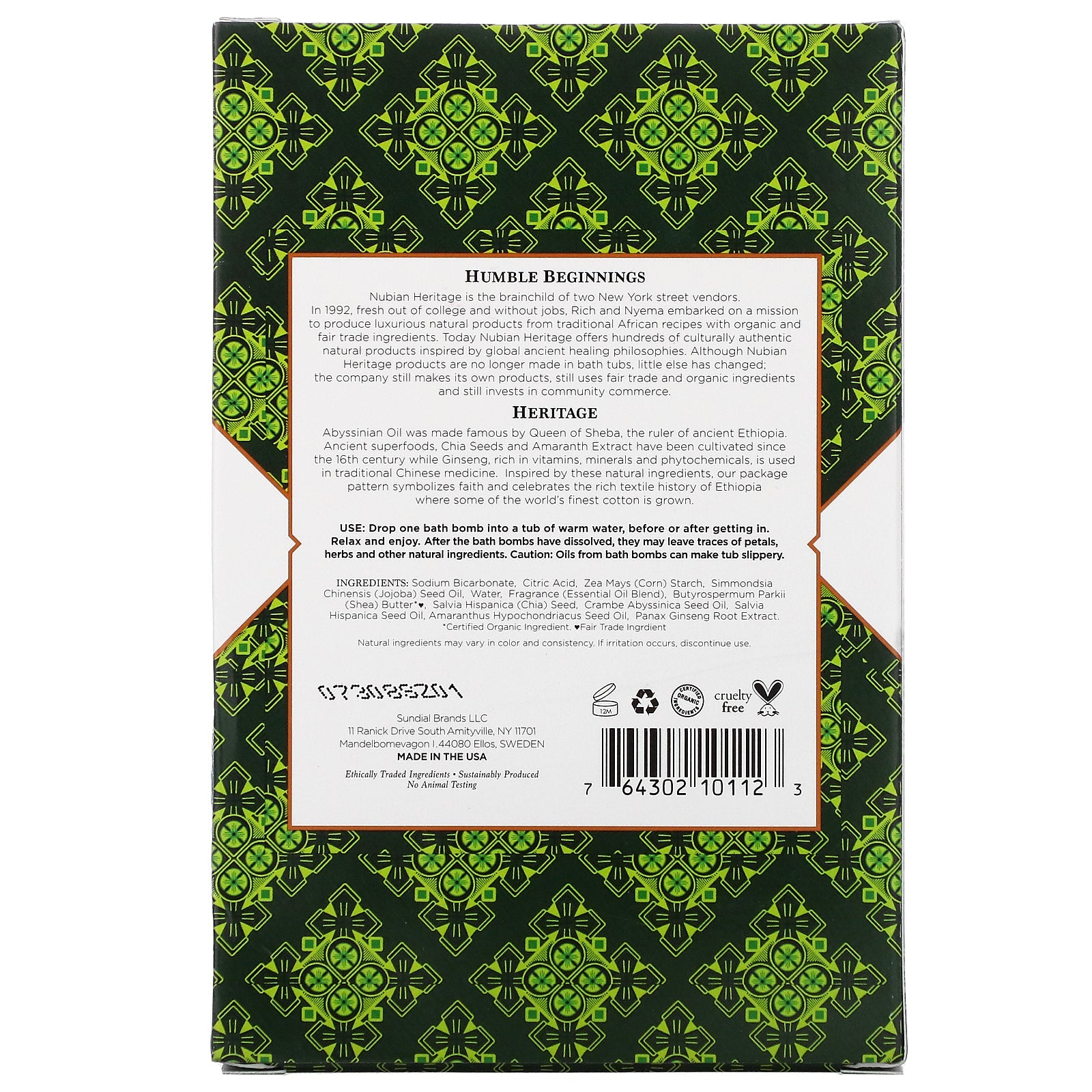 Certificerede økologiske ingredienser Grusomhedsfrie etisk handlede ingredienser Bæredygtigt produceret Ingen dyreforsøg Fordyb dig i en luksuriøs badeoplevelse med disse naturlige, sprudlende badebomber tilsat raffinerede chiafrø. Slap af, mens den rige, træagtige, blomsteragtige duft omslutter dine sanser, mens det forvandlede vand renser og blødgør, så din hud efterlader en delikat duft. Lavet med: Amaranth Extract & Ginseng Humble Beginnings Nubian Heritage er udtænkt af to gadesælgere i New York. I 1992, frisk på universitetet og uden job, påbegyndte Rich og Nyema en mission om at producere luksuriøse naturlige produkter ud fra traditionelle afrikanske opskrifter med fairtrade ingredienser. I dag tilbyder Nubian Heritage kulturelt autentiske naturprodukter inspireret af globale antikke helbredende filosofier. Selvom Nubian Heritage-produkter ikke længere laves i badekar, har lidt andet ændret sig; virksomheden laver stadig sine egne produkter, bruger stadig fair trade-ingredienser og investerer stadig i samfundshandel. Heritage Abyssinian Oil blev gjort berømt af dronningen af Saba, herskeren over det gamle Etiopien. Gamle superfoods, chiafrø og amarantekstrakt er blevet dyrket siden det 16. århundrede, mens ginseng, rig på vitaminer, mineraler og fytokemikalier, bruges i traditionel kinesisk medicin. Inspireret af disse naturlige ingredienser symboliserer vores pakkemønster tro og hylder Etiopiens rige tekstilhistorie, hvor noget af verdens fineste bomuld dyrkes.