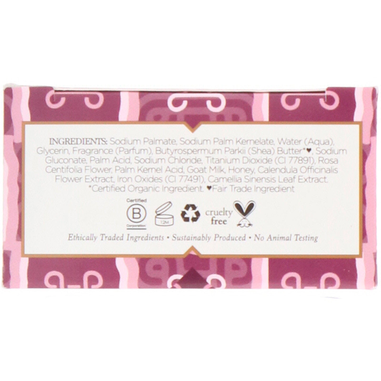 Natriumpalmat, natriumpalmekernelat, vand (akva), glycerin, duft (parfum), butyrospermum parkii (shea) smør* ♥ , natriumgluconat, palmesyre, natriumchlorid, titaniumdioxid (ci 77891), rosa centifolia blomst, palmekerne syre, gedemælk, honning, calendula officinalis blomsterekstrakt, jernoxider (ci 77491), camellia sinensis bladekstrakt. Fremstillet i USA med etisk fremskaffede ingredienser fra hele verden. *Certificeret økologisk ingrediens. ♥ Fairtrade ingrediens. Supplerende Fakta