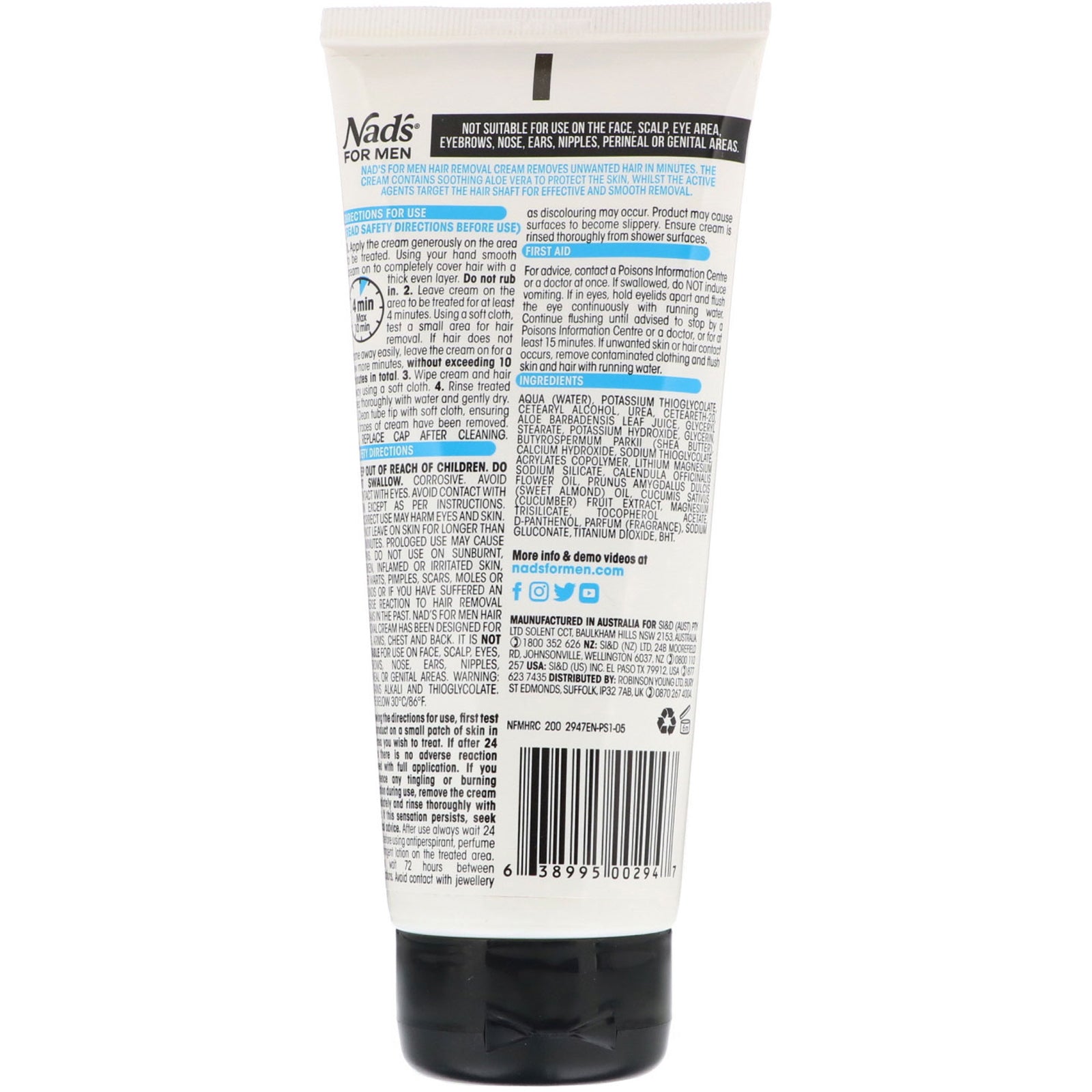 4 min hurtigvirkende smertefri, hurtig, effektiv bryst, ryg, ben, arme Nad's for Men hårfjerningscreme fjerner uønsket hår på få minutter. Cremen indeholder beroligende aloe vera for at beskytte huden, mens de aktive stoffer målretter hårstrået for effektiv og glat fjernelse.