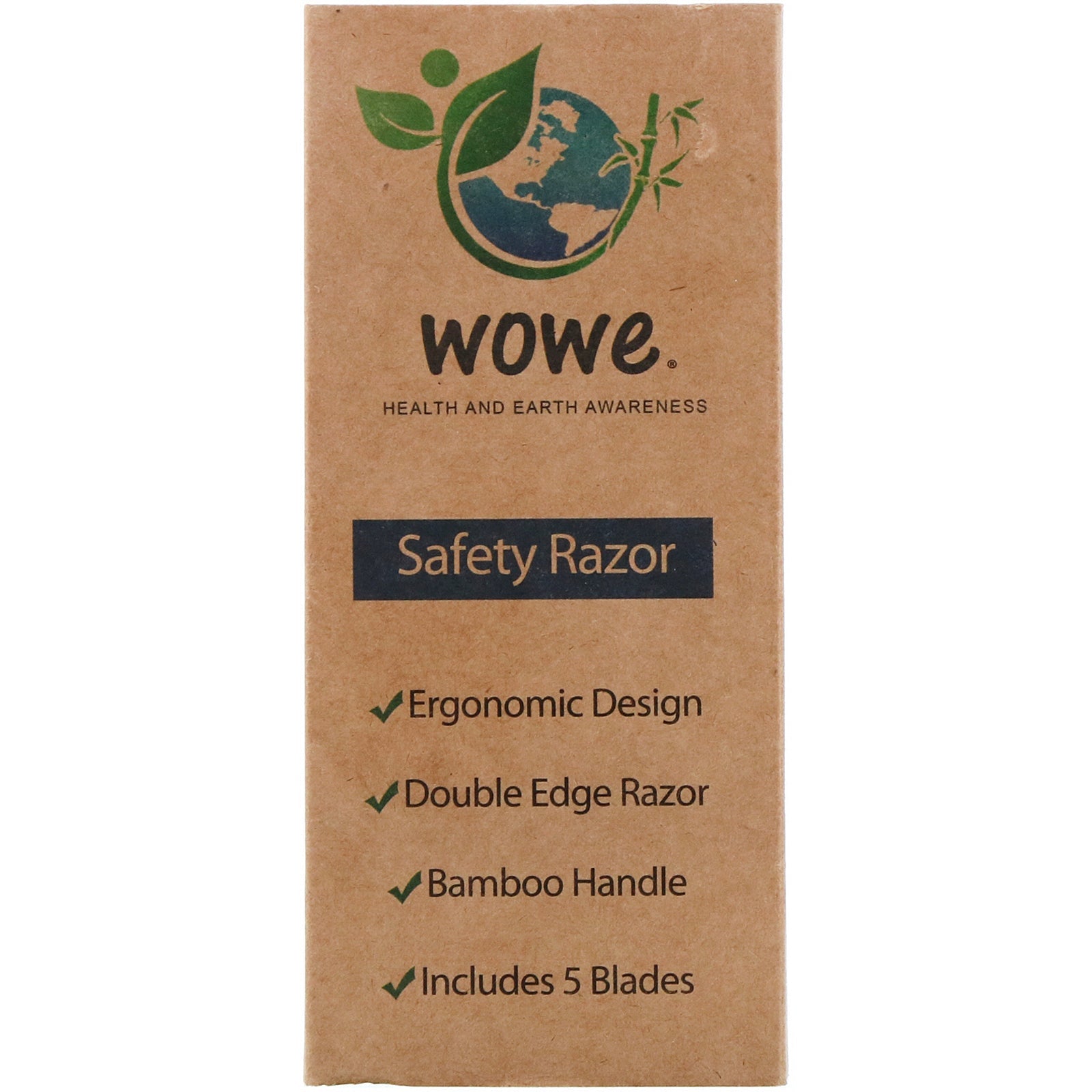 Wowe, dobbeltkantet sikkerhedsskraber med bambushåndtag, 1 barberkniv, 5 blade