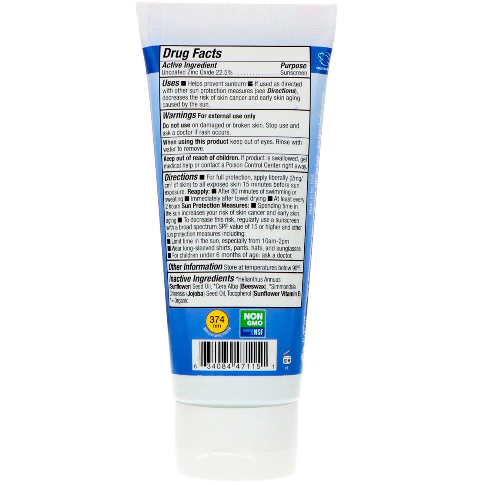 Sport klar zink Ikke-blegende Sport beskyttelse Vandtæt 80 min ikke GMO klar zink Biologisk nedbrydelig 98% organiske ingredienser og klar zinkoxid NSF indeholder organiske ingredienser certificeret af QAI til NSF/ANSI 305 certificeret af NSF til NSF Ikke-GMO Corporation True North Cert Cruelty Free Uses: Hjælper med at forhindre solskoldning Sugg. Brug For fuld beskyttelse, påfør rigeligt (2 mg/cm² hud) på al udsat hud 15 minutter før soleksponering. Påfør igen: Efter 80 minutters svømning eller sveden umiddelbart efter håndklædetørring Mindst hver 2. time Solbeskyttelsesforanstaltninger: At tilbringe tid i solen øger din risiko for hudkræft og tidlig aldring af huden For at mindske denne risiko skal du regelmæssigt bruge en solcreme med et bredt spektrum. SPF-værdi på 15 eller højere og andre solbeskyttelsesforanstaltninger, herunder: Begræns tid i solen, især fra kl. 10.00-14.00 Bær langærmede skjorter, bukser, hatte og solbriller. For børn under 6 måneder: Spørg en læge. Andre ingredienser Lægemiddelfakta Aktiv ingrediens...