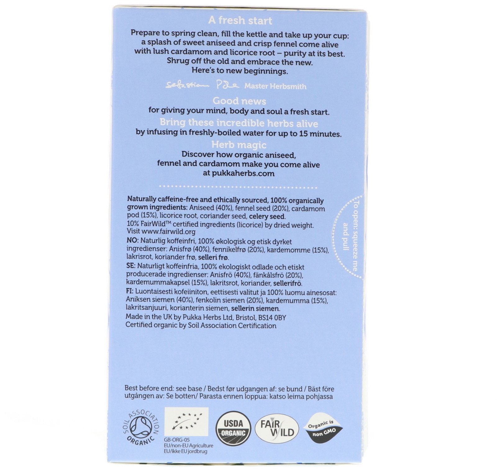 Great Taste Gold 2011 En ren fusion af anis, fennikel og kardemomme certificeret af Soil Association Certification USDA Fair Wild er ikke-GMO Kosher En frisk start Forbered dig på forårsrengøring, fyld kedlen og tag din kop op: et stænk søde anisfrø og sprøde fennikel kommer til live med frodig kardemomme og lakridsrod - renhed, når det er bedst. Træk på det gamle og omfavn det nye. Her er til nye begyndelser. -Sebastian Pole, Master Herbsmith Gode nyheder for at give dit sind, krop og sjæl en frisk start. Sugg. Brug Bring disse utrolige urter til live ved at infusionere i friskkogt vand i op til 15 minutter. Andre ingredienser Naturligt koffeinfri og etisk fremskaffede, 100% allieret dyrkede ingredienser: anis (40%), fennikelfrø (20%), kardemommebelg (15%), lakridsrod, korianderfrø, sellerifrø. 10% FairWild certificerede ingredienser (lakrids) efter tørret vægt. Supplerende Fakta Ansvarsfraskrivelse Mens VitaminsUK bestræber sig på at sikre nøjagtigheden af sine produktbilleder og...