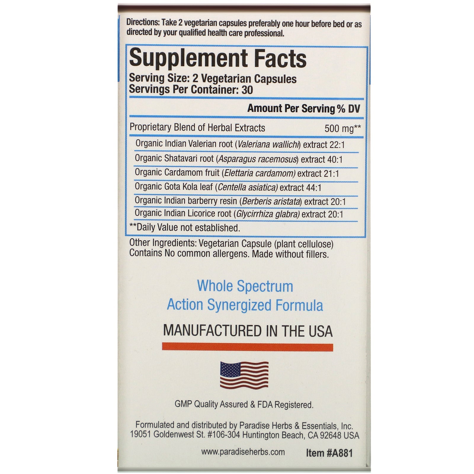 Portionsstørrelse: 2 Vegetariske Kapsler Portioner pr. beholder: 30 Mængde pr. portion %DV Proprietær blanding af urteekstrakter 500 mg ** Økologisk indisk baldrianrod (Valeriana wallichi) ekstrakt 22:1 Økologisk Shatavari rod (Asparges racemosus) ekstrakt 40:1 Økologisk kardemomme frugt (Elettaria cardamon) ekstrakt 21:1 Økologisk Gota Kola blad (Centella asiatica) ekstrakt 44:1 Økologisk indisk berberis harpiks (Berberis aristata) ekstrakt 20:1 Økologisk indisk lakridsrod (Glycirrhiza glabra) ekstrakt 20:1 **Daglig værdi ikke etableret. Ansvarsfraskrivelse