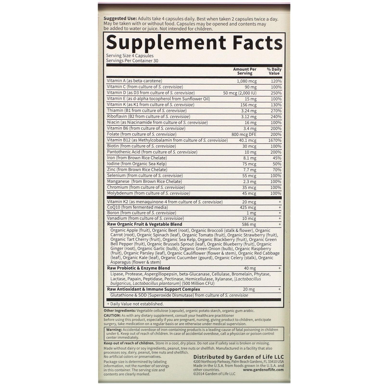 Portionsstørrelse: 4 kapsler Portioner pr. beholder: 30 Mængde pr. portion % Daglig værdi A-vitamin (som beta-caroten) 1.080 mcg 120 % C-vitamin (fra kultur af S. cerevisiae) 90 mg 100 % D-vitamin (som D3 fra kultur af S. cerevisiae) 50 mcg (2.000 IE) 250% Vitamin E (som d-alpha tocopherol fra solsikkeolie) 15 mg 100% Vitamin K (som K1 fra kultur af S. cerevisiae) 156 mcg 130% Thiamin (B1 fra kultur af S. cerevisiae) 3,24 mg 270% Riboflavin (B2 fra kultur af S. cerevisiae) 3,12 mg 240% Niacin (som Niacinamid fra kultur af S. cerevisiae) 16 mg 100% Vitamin B6 (fra kultur af S. cerevisiae) 2004 mg 3. % Folat (fra kultur af S. cerevisiae) 800 mcg DFE 200% Vitamin B12 (som Methylcobalamin fra kultur af S. cerevisiae) 40,1 mcg 1670% Biotin (fra kultur af S. cerevisiae) 30 mcg 100% Pantothenisk kultur (Acid) S. cerevisiae) 10 mg 200 % Jern (fra brun ris chelat) 8,1 mg 45 % jod (fra økologisk havtang) 75 mcg 50 % zink (fra brun ris chelat) 7,7 mg 70 % selen (fra kultur af S. cerevisiae) 55 mcg 100% mangan (fra brun rischelat) 2,3 mg 100% krom (fra kultur af S. cerevisiae) 35 mcg 100% molybdæn (fra kultur af S. cerevisiae) 45 mcg 100% kultur Vitamin K2 (som menaquinone) af S. cerevisiae) 20 mcg + CoQ10 (fra fermenterede medier) 425 mg + Bor (fra kultur af S. cerevisiae) 1 mg + Vanadium (fra kultur af S. cerevisiae) 10 mcg + Rå økologisk frugt- og grøntsagsblanding økologisk æble ( frugt), økologisk sukkerroer (rod), økologisk broccoli (stilk og blomst), økologisk gulerod (rod), økologisk spinat (blad), økologisk tomat (frugt), økologisk jordbær (frugt), økologisk tærtekirsebær (frugt), økologisk hav Kelp, økologisk brombær (frugt), økologisk grøn paprika (frugt), økologisk rosenkål (blad), økologisk blåbær (frugt), økologisk ingefær (rod), økologisk hvidløg (løg), økologisk grønt løg (løg), økologisk hindbær (frugt), økologisk persille (blad), økologisk blomkål (blomst og stilk), økologisk rødkål (blad), økologisk grønkål (blad), økologisk agurk (græskar), økologisk selleri (stilk), økologiske asparges (blomst og stilk) 586 mg + RAW probiotika- og enzymblanding Lipase, Protease, Aspergillopepsin, beta-Glucanase, Cellulase, Bromelain, Phytase, Lactase, Papain, Peptidase, Pectinase, Hemicellulase, Xylanase, [Lactobacillus bulgaricus, Lactobacillus bulgaricus, Lactobacillus bulgaricus, Lactobacillus 0 Millar00 mgFU, Lact400 Millobacion] + RAW Antioxidant & Immune Support Complex Glutathion & SOD (Superoxid Dismutase) fra kultur af S. cerevisiae 20 mg + +Daglig værdi ikke fastlagt. Ansvarsfraskrivelse