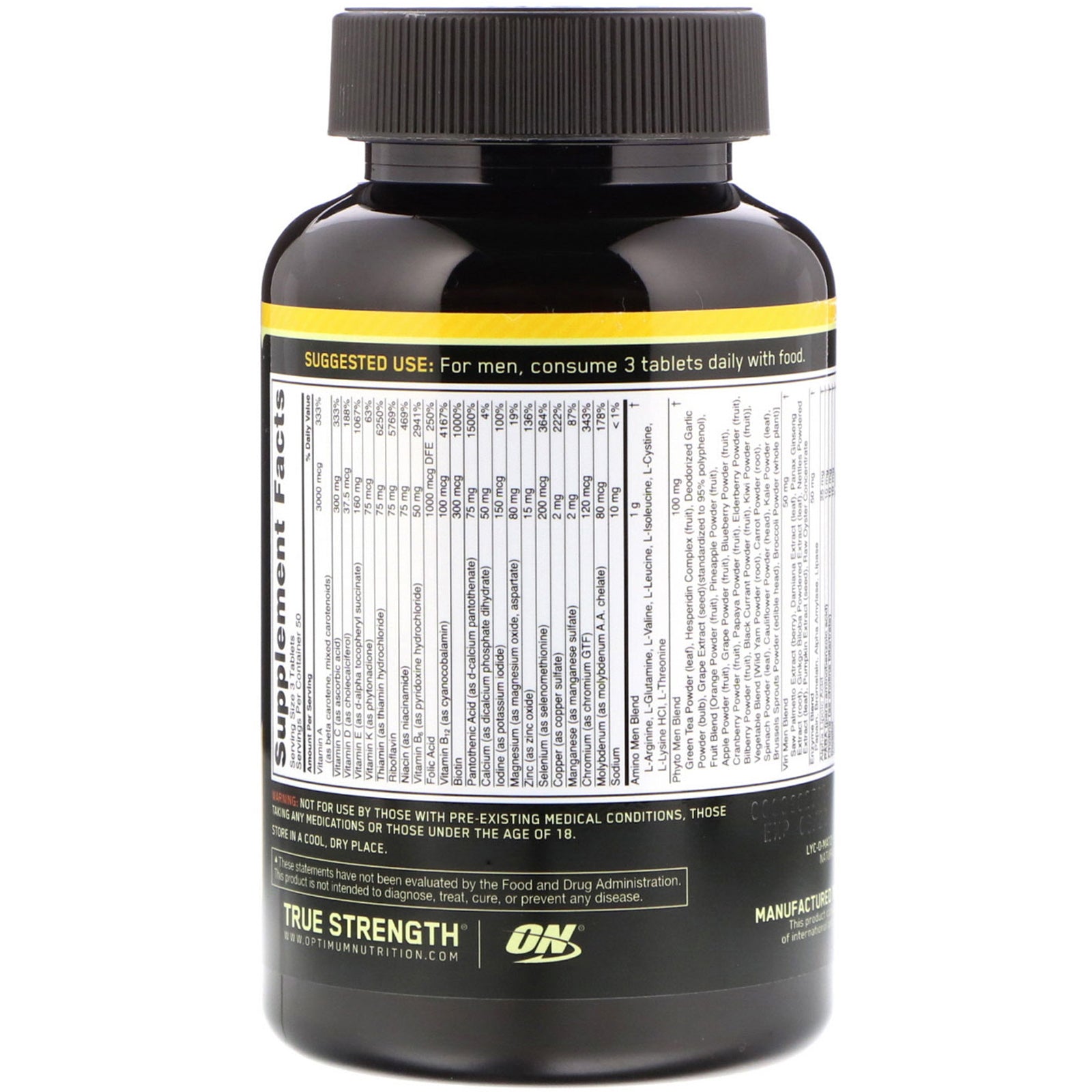 Portionsstørrelse: 3 tabletter Portioner pr. beholder: 50 Mængde pr. portion %Daglig værdi A-vitamin (som beta-caroten, blandede carotenoider) 3000 mcg 333 % C-vitamin (som ascorbinsyre) 300 mg 333 % D-vitamin (som cholecalciferol) 37,5 mcg. % E-vitamin (som d-alfa-tocopherylsuccinat) 160 mg 1067 % K-vitamin (som phytonadion) 75 mcg 63 % Thiamin (som thiaminhydrochlorid) 75 mg 6250 % Riboflavin 75 mg 5769 % Niacin (som niacin-vitamin 46) B6 (som pyridoxin hydrochlorid) 50 mg 2941% Folinsyre 1000 mcg DFE 250% Vitamin B12 (som cyanocobalamin) 100 mcg 4167% Biotin 300 mcg 1000% Pantothensyre (som d-calcium 1000 mg calcium 50 calcium calcium) phate dihydrat) 50 mg 4% Jod (som kaliumiodid) 150 mcg 100% Magnesium (som magnesiumoxid, aspartat) 80 mg 19% Zink (som zinkoxid) 15 mg 136% Selen (som selenmethionin) 200 mcg Copper (3as64% Kobber). kobbersulfat) 2 mg 222% Mangan (som mangansulfat) 2 mg 87% Chrom (som krom GTF) 120 mcg 343% Molybdæn (som molybdæn AA chelat) 80 mcg 178% Natrium 10 mg Blend LArgin Men <1% Amino , L-Glutamin, L-Valine, L-Leucin, L-Isoleucin, L-Cystin, L-Lysin HCl, L-Threonin 1 g † Phyto Men Blend Green Tea Pulver (blad), Hesperidin Complex (frugt), Deodoriseret hvidløg Pulver (løg), drueekstrakt (frø) (standardiseret til 95% polyphenol), frugtblanding [appelsinpulver (frugt), blåbærpulver (frugt), tranebærpulver (frugt), papayapulver (frugt), hyldebærpulver (frugt) , Blåbærpulver (frugt), Solbærpulver (frugt), Kiwipulver (frugt)], Grøntsagsblanding [Wild Yam Pulver (rod), Gulerodspulver (rod), Spinatpulver (blad), Blomkålspulver (hoved), Grønkål Pulver (blad), rosenkålspulver (spiseligt hoved), Broccolipulver (hele planten)] 100 mg † Viri Men Blend Saw Palmetto-ekstrakt (bær), Damiana-ekstrakt (blad), Panax Ginseng-ekstrakt (rod), Ginkgo Biloba-pulverekstrakt (blad), brændenælder pulveriseret ekstrakt (blad), græskar ekstrakt (frø), rå østers koncentrat. 50 mg † Enzymblanding Papain, Bromelain, Alpha Amylase, Lipase 50 mg † Alpha Lipoic Acid 25 mg † PABA (para-aminobenzoesyre) 10 mg † Cholin (som cholin bitartrat) 10 mg † Inositol † Inositol 10 mg Boron † (Lyc-O-Mato®) 500 mcg † Lutein 500 mcg † Alfa-caroten 140 mcg † Vanadium 100 mcg † Cryptoxanthin 34 mcg † Zeaxanthin 28 mcg † Daily Værdi ikke fastlagt. Ansvarsfraskrivelse