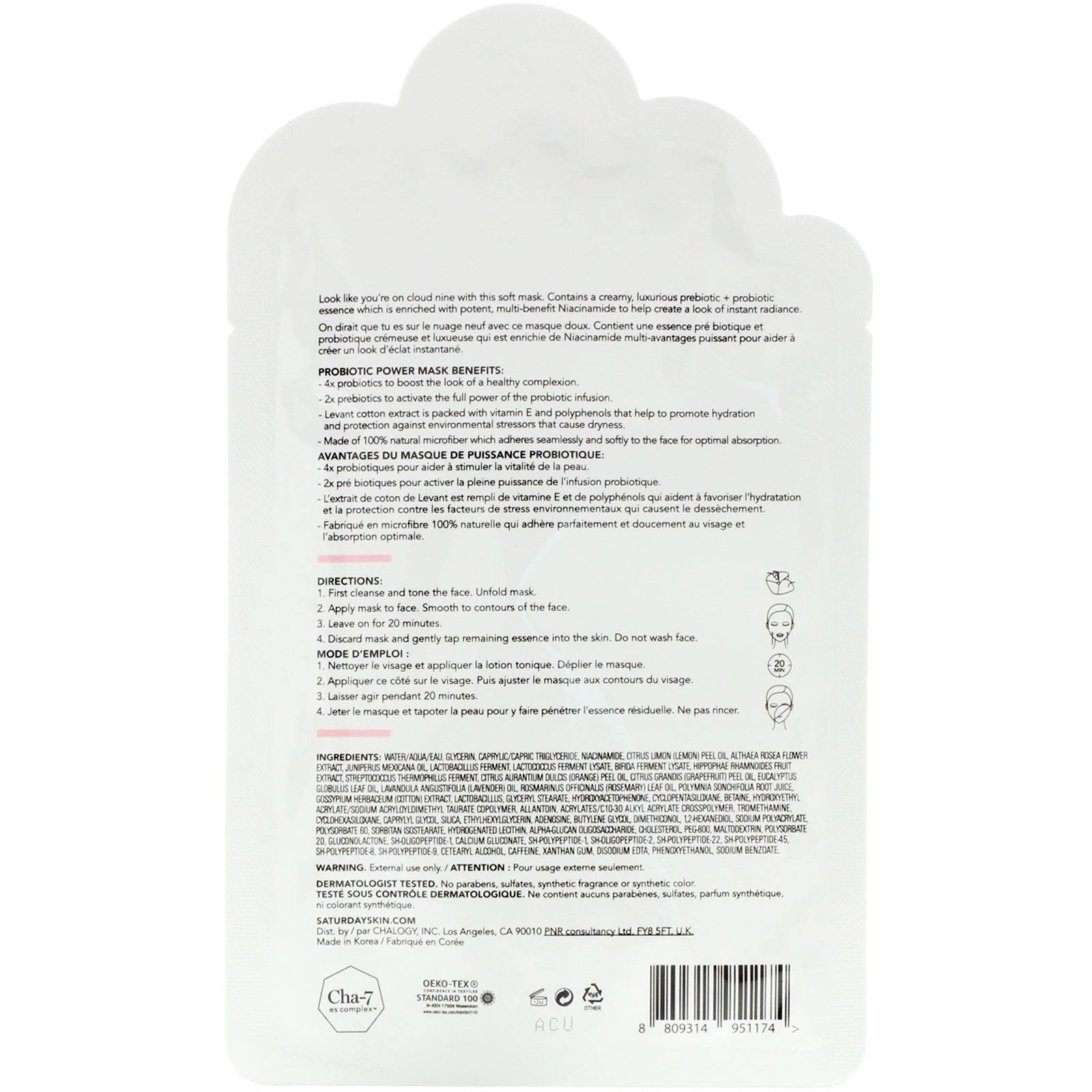 Probado por dermatólogos Sin parabenos, sulfatos, fragancias sintéticas ni color sintético Complejo Cha-7 es Parece que estás en la nube nueve con esta mascarilla suave. Contiene una esencia prebiótica + probiótica cremosa y lujosa que está enriquecida con niacinamida potente y multibeneficio para ayudar a crear una apariencia de luminosidad instantánea. Beneficios de la mascarilla Probiotic Power: 4x probióticos para mejorar la apariencia de un cutis saludable. 2x prebióticos para activar todo el poder de la infusión de probióticos. El extracto de algodón de Levante está repleto de vitamina E y polifenoles que ayudan a promover la hidratación y la protección contra los factores ambientales estresantes que causan sequedad. Fabricada en microfibra 100% natural que se adhiere de forma perfecta y suave al rostro para una óptima absorción.