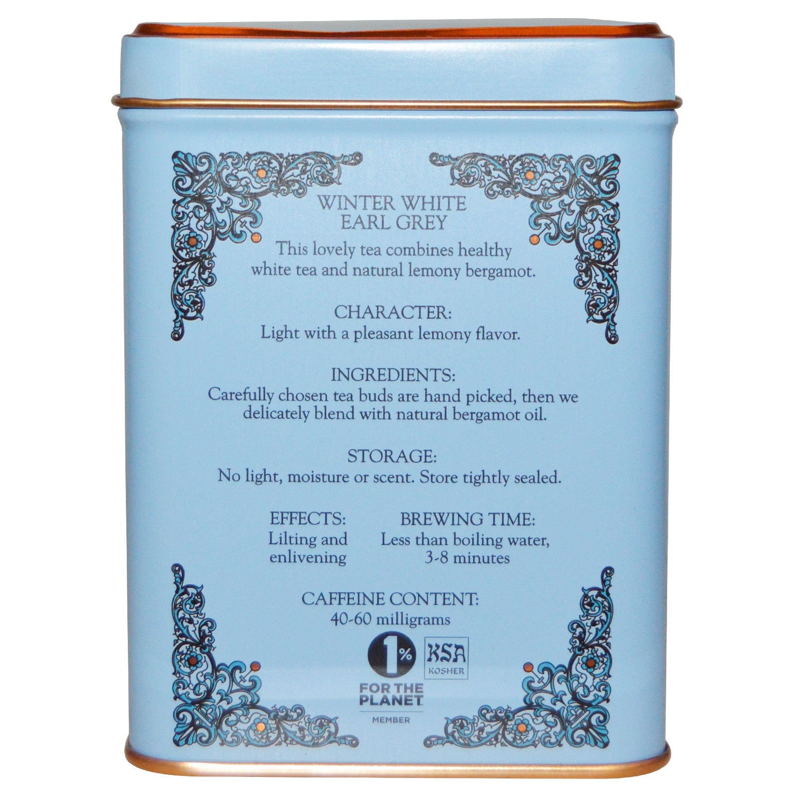 Mezclas de té Té blanco Mutan único y poco común con bergamota Kosher Winter White Earl Grey Este delicioso té combina té blanco saludable y bergamota alimonada natural. Carácter: Ligero con un agradable sabor a limón. Efectos: Amenizante y revitalizante. Una colaboración familiar dio origen a HT: mezcla de té única y poco común. HT se basa en la tradición de Harney de proporcionar tés y hierbas de hoja entera de la mejor calidad, todo ello empaquetado en una impresionante bolsita de té sedosa. Ahora puede disfrutar de la sofisticación de los tés de hoja entera con la comodidad de una bolsita de té. Sugerir. Usar Tiempo de preparación: Menos que agua hirviendo, 3-8 minutos La forma correcta de preparar té blanco Calienta la olla con agua hirviendo hasta que esté tibia al tacto. Deseche esa agua y use un sobre para dos tazas de té. Vierta menos agua hirviendo...