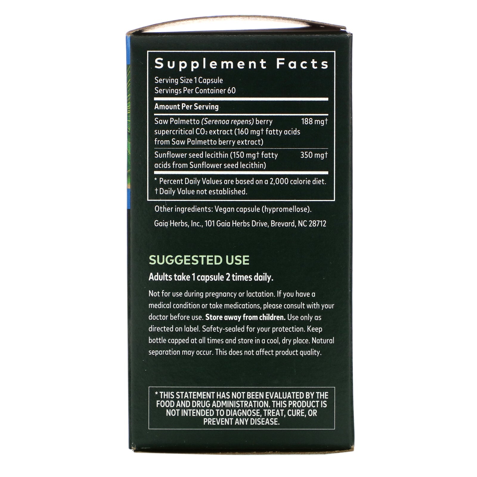 Tradicionalmente para mantener la función saludable de la próstata Extracto concentrado de una sola hierba Suplemento de hierbas Est. 1987 Pureza - Potencia - Integridad Vegano Sin gluten Sin soja Certificado B Corporation Conectando plantas y personas desde 1987 Gaia Herbs ofrece una trazabilidad sin precedentes al examinar cada producto. Pureza: manténgalo limpio Todos los productos se analizan para detectar pesticidas, microbios y metales pesados. Integridad: manténgalo real Potencia: manténgalo fuerte Los extractos de plantas concentrados se entregan en nuestra tecnología patentada Phyto-Caps®. Sugerir. Usar Los adultos toman 1 cápsula 2 veces al día. Otros ingredientes Cápsula vegana (hipromelosa). Hechos suplementarios Tamaño de la porción: 1 cápsula Porción por envase: 60 Cantidad por porción % valor diario Extracto de CO2 supercrítico de bayas de Saw Palmetto (Serenoa repens) (160 mg† ácidos grasos del extracto de bayas de Saw Palmetto) 188 mg † Lecitina de semilla de girasol (150 mg† de...