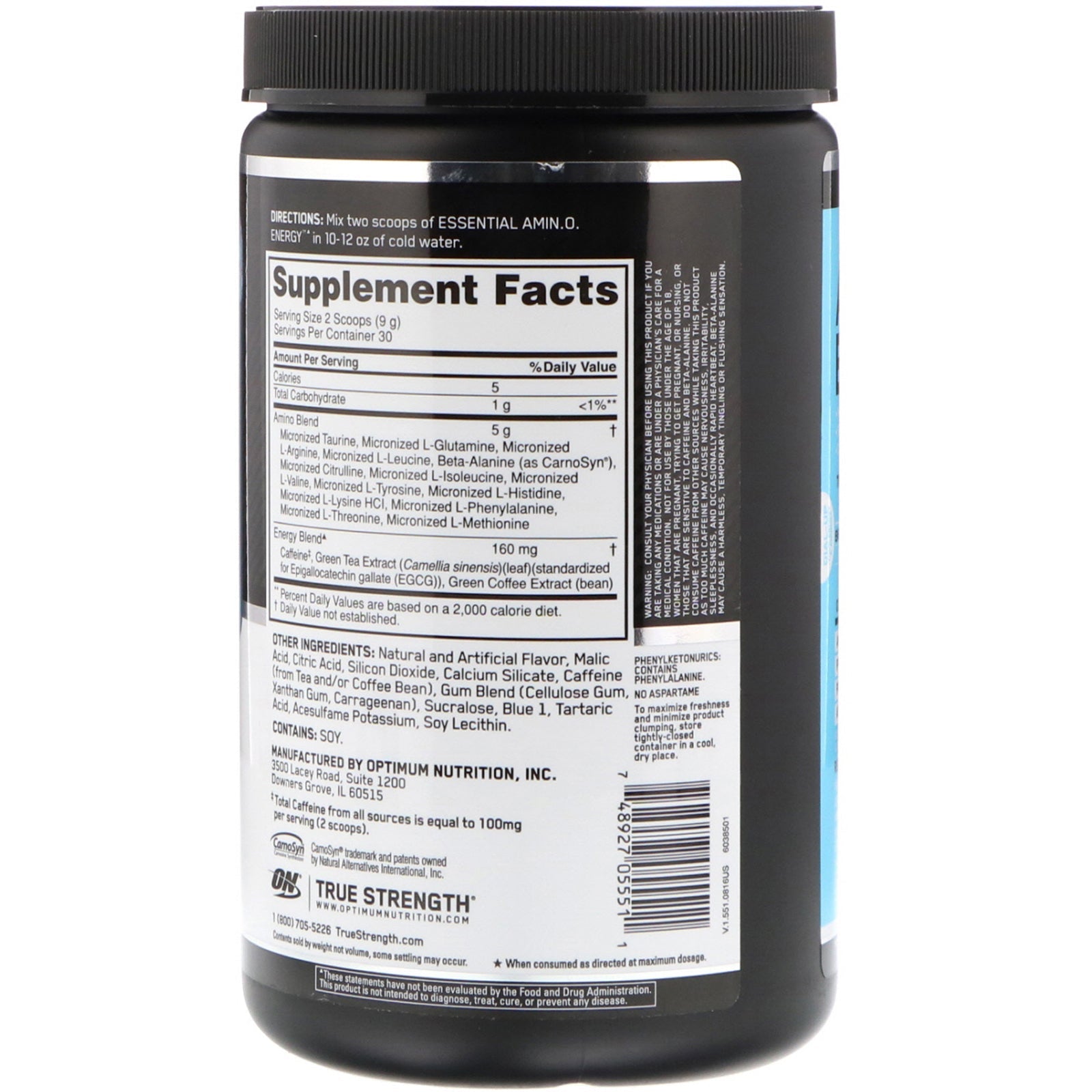 Tamaño de la porción: 2 cucharadas (9 g) Porciones por envase: 30 Cantidad por porción % valor diario Calorías 5 g Carbohidratos totales 1 g <1%** Mezcla de aminoácidos Taurina micronizada, L-glutamina micronizada, L-arginina micronizada, L-glutamina micronizada Leucina, beta-alanina (como CarnoSyn®), citrulina micronizada, L-tirosina micronizada, L-histidina micronizada, L-lisina HCI micronizada, L-fenilalanina micronizada, 5 g † Mezcla energética de cafeína‡, extracto de té verde (Camellia sinensis) (hoja) (estandarizado para galato de epigalocatequina (EGCG)), extracto de café verde (frijol) 160 mg † **Porcentaje de valores diarios basados en una dieta de 2000 calorías. †Valor diario no establecido ‡El total de cafeína de todas las fuentes es igual a 100 mg por porción (2 cucharadas) Descargo de responsabilidad