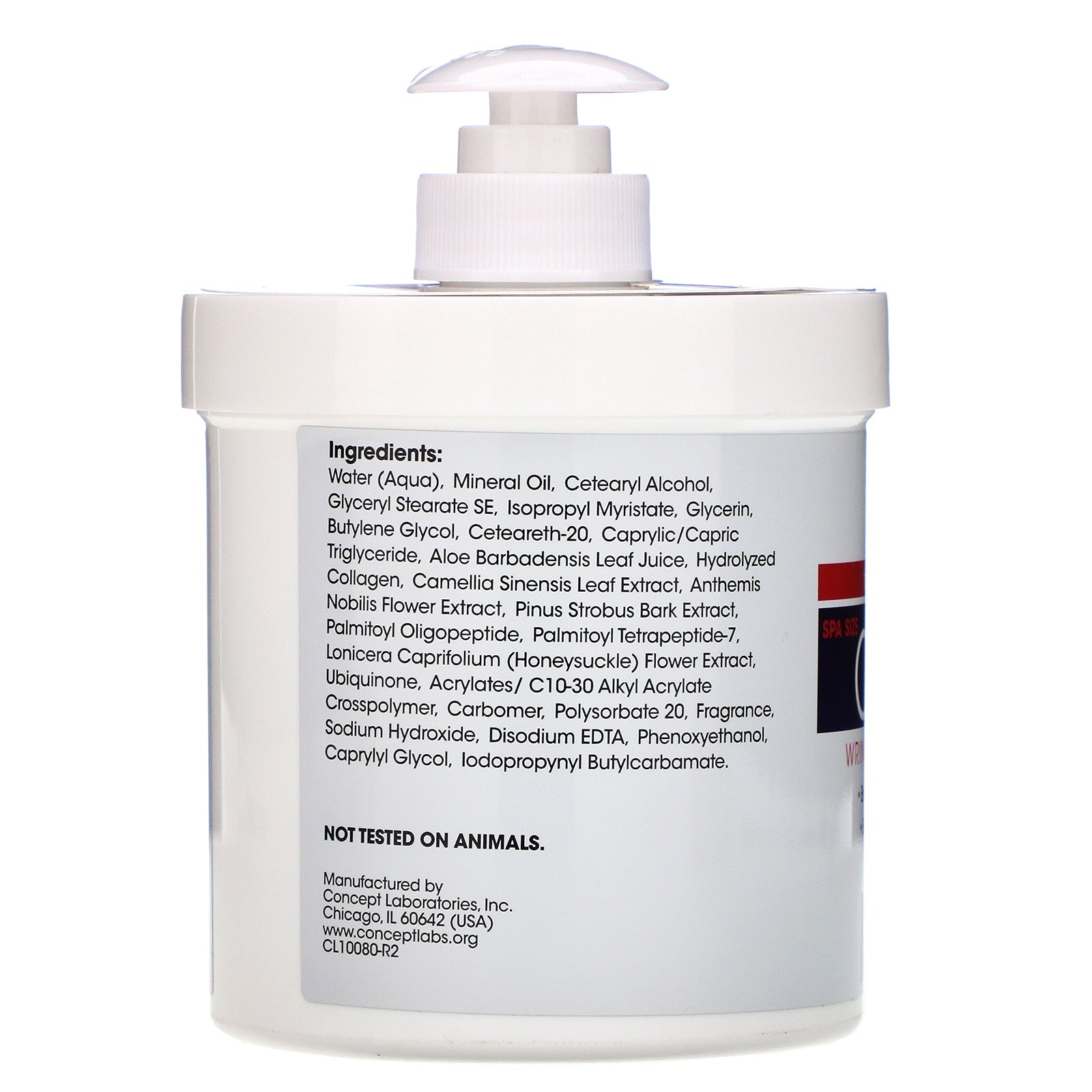Spa Size Anti-Aging Power For Salon Professionals Enzymatic Anti-Aging Complex Energizes & Renews Dull Skin Antioxidant Hydration + Peptides, Honeysuckle, Green Tea Not Tested On AnimalsSugg. UseApply a sufficient amount of lotion onto cleansed face, neck and body. Gently massage into skin using upward circular motions, paying special attention to the wrinkles, until fully absorbed. Use daily.Other IngredientsWater (aqua), mineral oil, cetearyl alcohol, butylene glycol, glycerin, aloe barbadensis leaf juice, glyceryl stearate se, isopropyl myristate, ceteareth-20, caprylic/capric triglyceride, hydrolyzed collagen, camellia sinensis leaf extract, anthemis nobilis flower extract, pinus strobus bark extract, palmitoyl oligopeptide, palmitoyl tetrapeptide-7, lonicera caprifolium (honeysuckle) flower extract, ubiquinone, acrylates/c10-30 alkyl acrylate crosspolymer, carbomer, polysorbate 20, fragrance, triethanolamine, disodium edta, phenoxyethanol, dmdm hydantoin, iodopropynyl butylcarbamate, yellow 10, red 40.Supplement FactsDisclaimerWhile VitaminsUK strives to ensure the accuracy of its product images and information, some manufacturing changes to packaging and/or ingredients may be pending update on our site. Although...