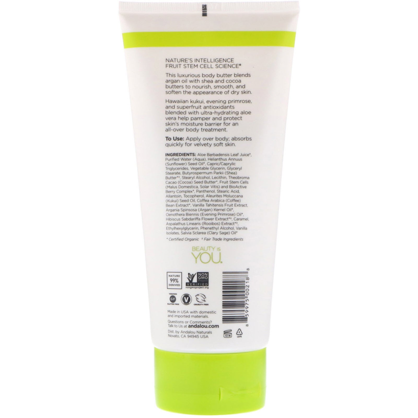 New Look Non GMO Tahitian Vanilla Superfruit Antioxidants Shea + Cocoa Butters Moroccan Argan Oil Fruit Stem Cell Science Beauty is You Nature 99% Derived Non GMO Project Verified Verified Gluten Free Vegan Cruelty Free Nature's Intelligence Fruit Stem Cell Science This luxurious body butter blends argan oil with shea and cocoa butters to nourish, smooth, and soften the appearance of dry skin. Hawaiian kukui, evening primrose, and superfruit antioxidants blended with ultra-hydrating aloe vera help pamper and protect skin’s moisture barrier for an all-over body treatment.Sugg. UseApply over body; absorbs quickly for velvety soft skin.Other IngredientsAloe barbadensis leaf juice*, purified water (aqua), helianthus annuus (sunflower) seed oil*, capric/caprylic triglycerides, vegetable glycerin, glyceryl stearate, butyrospermum parkii (shea) butter*†, stearyl alcohol, lecithin, theobroma cacao (cocoa) seed butter*, fruit stem cells (malus domestica, solar vitis) and bioactive 8 berry complex*, panthenol, stearic acid, allantoin, tocopherol, aleurites moluccana (kukui) seed oil, coffea Arabica...