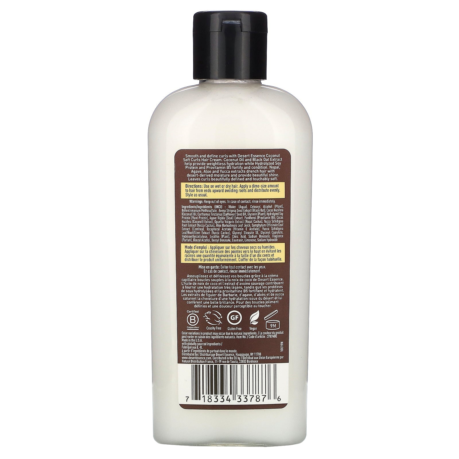 Certified B Corporation Cruelty Free Gluten Free Vegan Smooth and define curls with Desert Essence Coconut Soft Curls Hair Cream. Coconut Oil and Black Oat Extract help provide weightless hydration while Hydrolyzed Soy Protein and Provitamin B5 fortify and condition. Nopal, Agave, Aloe and Yucca extracts drench hair with desert-derived moisture and provide beautiful shine. Leaves curls beautifully defined and touchably soft.Sugg. UseUse on wet or dry hair. Apply a dime-size amount to hair from ends upward avoiding roots and distribute evenly. Style as usual.Other IngredientsWater (aqua), cetearyl alcohol (plant), behentrimonium methosulfate, avena strigosa seed extract (black oat), cocos nucifera (coconut) oil, carthamus tinctorius (safflower) seed oil, glycerin (plant), hydrolyzed soy protein (plant protein), agave rigida (sisal) extract, panthenol (provitamin B5), cocos nucifera (coconut) extract, opuntia vulgaris extract (nopal cactus), yucca schidigera root extract (yucca cactus), aloe barbadensis leaf juice, symphytum officinale leaf extract (comfrey), tocopheryl acetate (vitamin E acetate),...