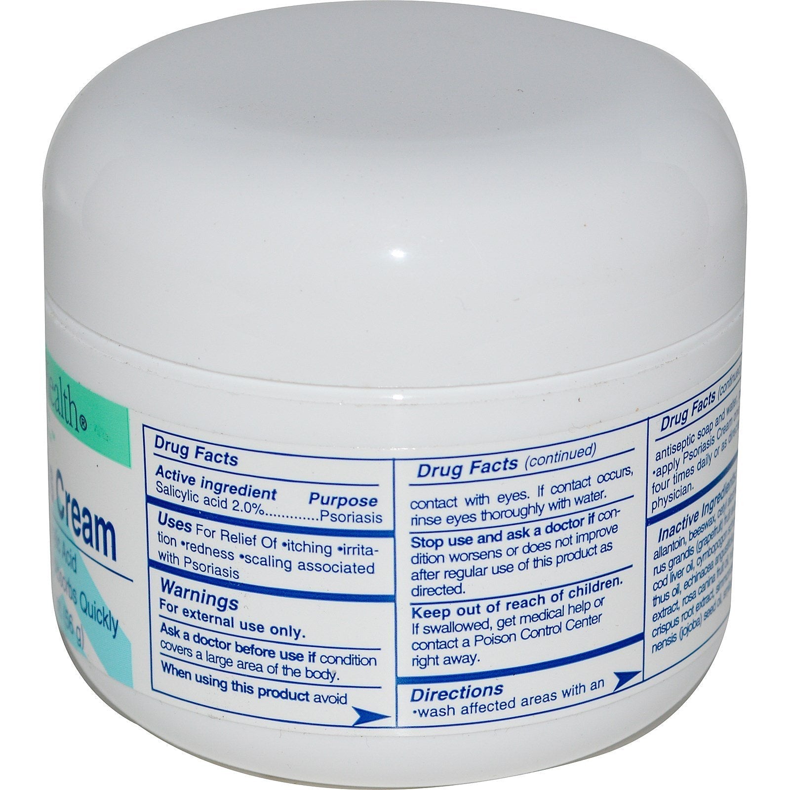 Natural Health Begins at Home 2% Salicylic Acid Paraben-Free Absorbs Quickly Guaranteed Quality, Laboratory Tested Uses For Relief Of: Itching Irritation Redness Scaling associated with PsoriasisSugg. UseWash affected areas with an antiseptic soap and water, pat dry. Apply Psoriasis Cream one to four times daily, or as directed by a physician.Other IngredientsNo parabens, no preservatives, no mineral oil, no petroleum, no artificial color, no artificial fragrance, no gluten.Supplement FactsDisclaimerWhile VitaminsUK strives to ensure the accuracy of its product images and information, some manufacturing changes to packaging and/or ingredients may be pending update on our site. Although items may occasionally ship with alternate packaging, freshness is always guaranteed. We recommend that you read labels, warnings and directions of all products before use and not rely solely on the information provided by VitaminsUK.