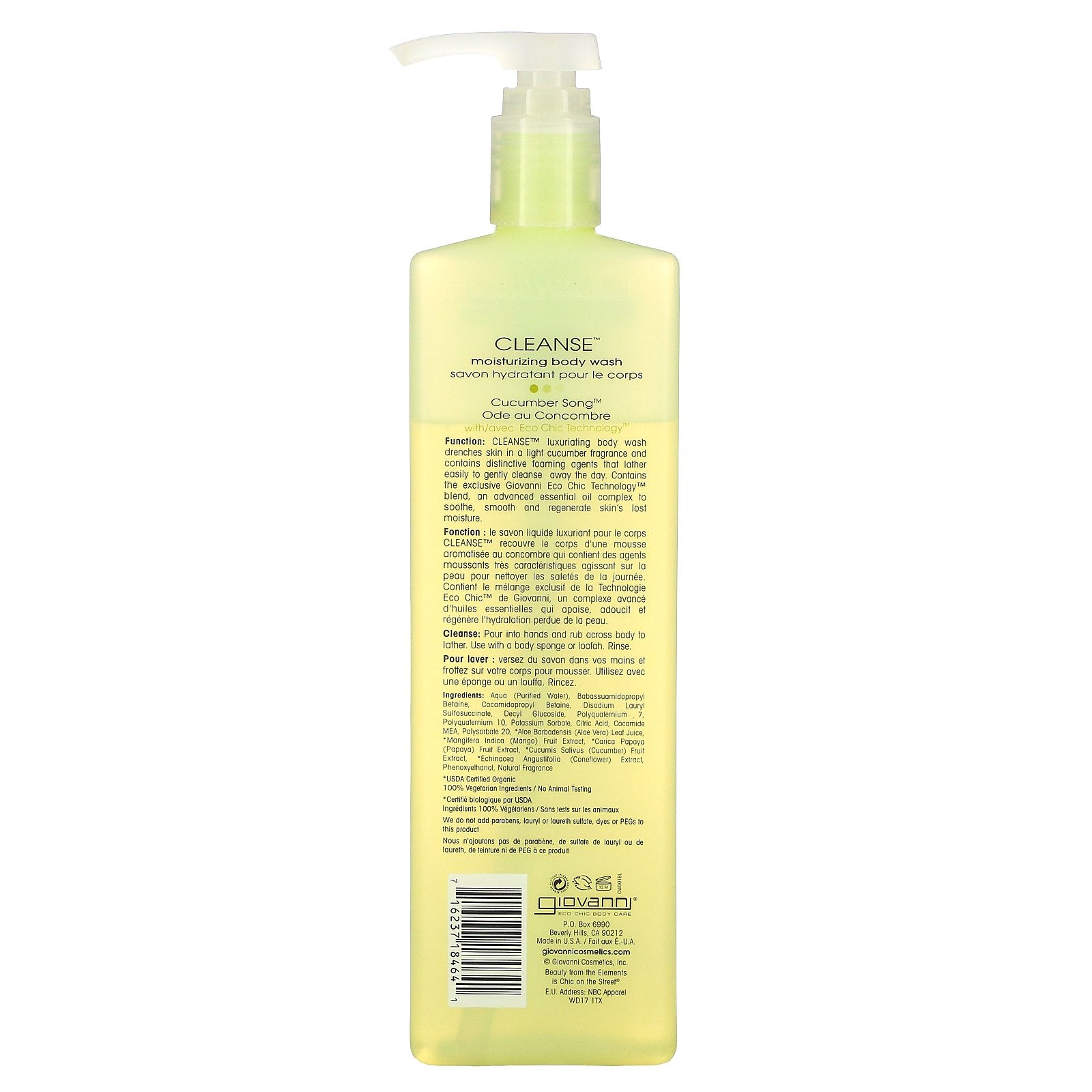 Eco Chic Technology™ Eco Chic Body Care 100% Vegetarian Ingredients No Animal Testing Leaping Bunny Certified Function: CLEANSE™ luxuriating body wash drenches skin in a light cucumber fragrance and contains distinctive foaming agents that lather easi