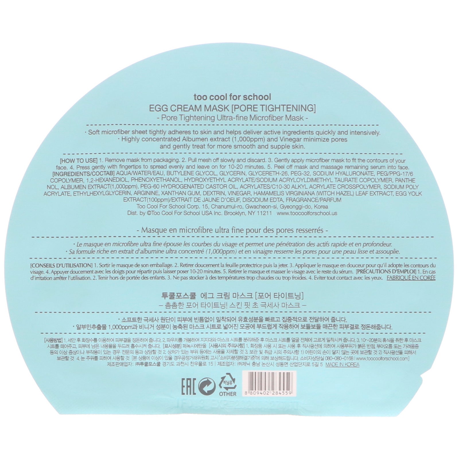 A Single-Use Ultra Microfiber Sheet Vinegar + Egg Yolk Extract Pore Tightening Ultra-Fine Microfiber Mask Soft microfiber sheet tightly adheres to skin and helps deliver active ingredients quickly and intensively. Highly concentrated Albumen extract (1,00