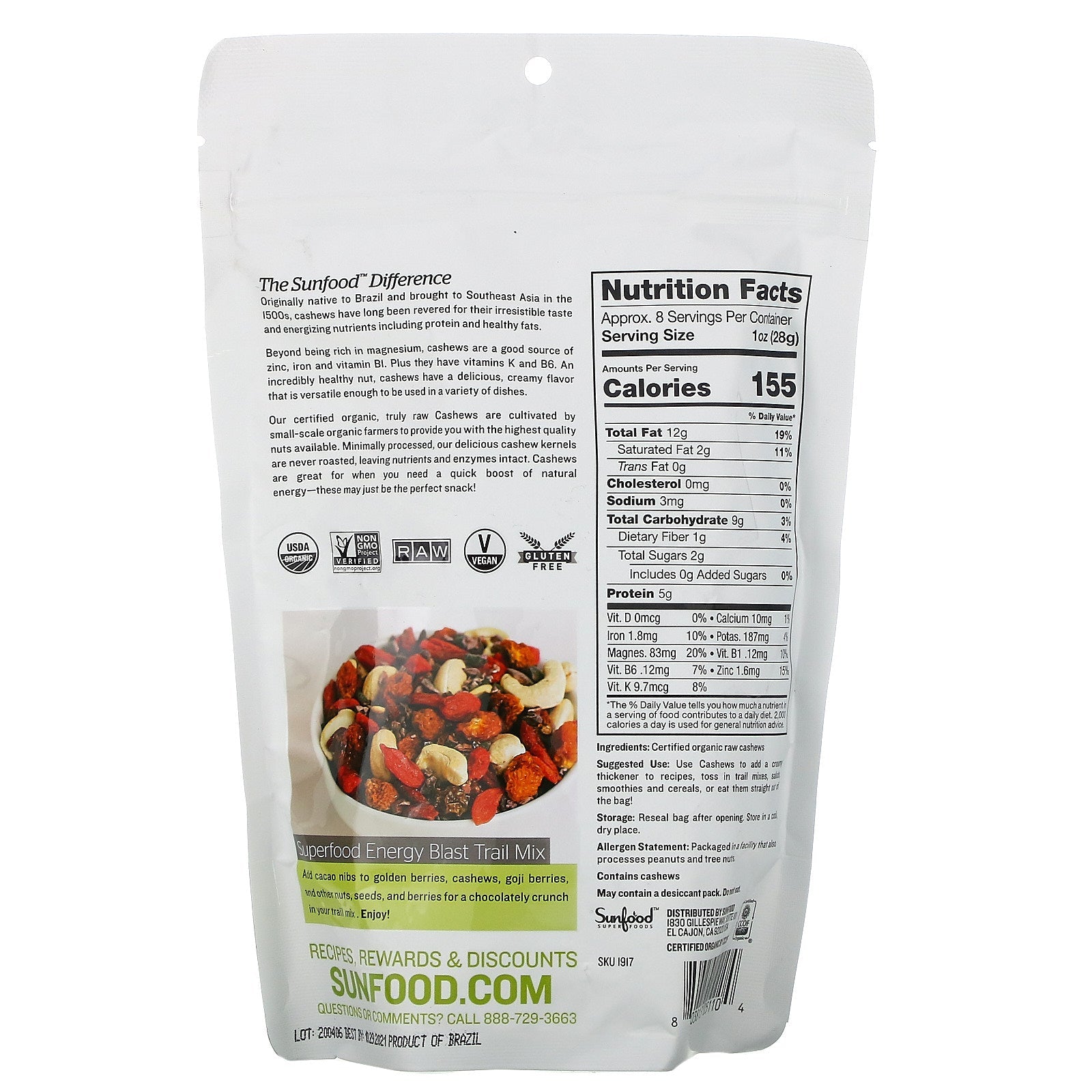 100% Organic No Preservatives No Additives No Added Sugars Delicious & Nutritious Superfood Snack USDA Organic NON GMO Project Verified Vegan RAW Certified Organic by CCOF Contains: Magnesium- Heart & Bones Zinc- Immune System Vitamin K- Heart Protector Trace Minerals- Maintenance & Repair 100% Certified Organic Cashews Originally native of Brazil and brought to Southeast Asia in the 1500s, cashews have long been revered for their protein, healthy fats and antioxidant properties. Raw cashews are naturally high in beautifying oleic acid, and contain magnesium, manganese, selenium, and zinc. Cashews have a delicious, creamy flavor that is versatile enough to be used in a variety of dishes. The Sunfood Difference Our certified organic, premium-quality cashews are sustainably grown by small-scale organic farmers to provide you with the best tasting, most natural cashews you can find. Our truly raw cashews are hand-cracked and never exposed to heat, which leaves nutrients and enzymes intact. Rich in protein and great for any time you need a quick boost of natural energy, these may just be the perfect snack!