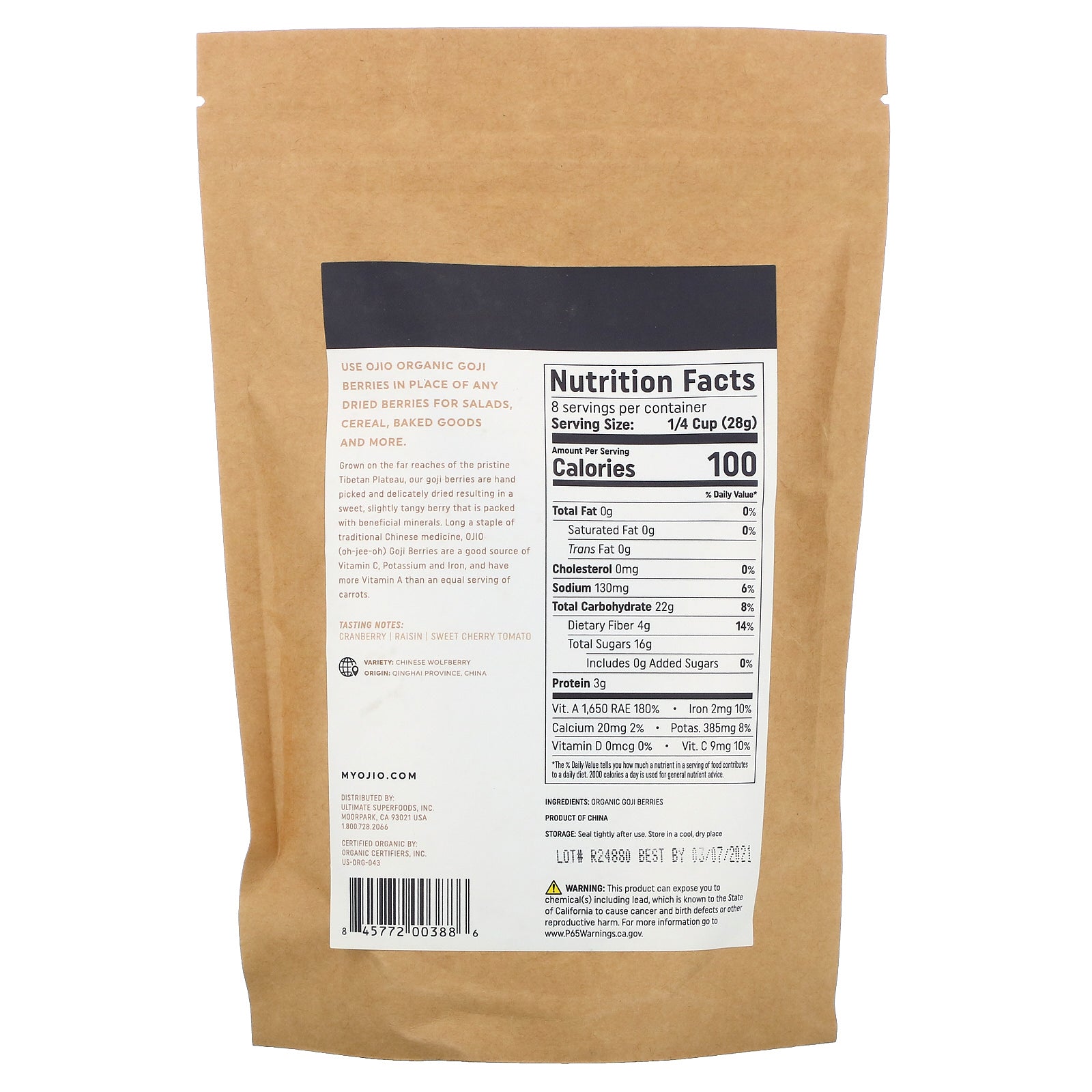 Hand Picked USDA Gluten Free Non GMO Certified by Certifiers, Inc Grown on the far reaches of the pristine Tibetan Plateau, our goji berries are hand picked and delicately dried resulting in a sweet, slightly tangy berry that is packed with beneficial minerals. Long a staple of traditional Chinese medicine, Ojio (Oh-jee-oh) Goji Berries are a good source of Vitamin C, Potassium and Iron, and have more Vitamin A than an equal serving of carrots. Tasting Notes: Cranberry | Raisin | Sweet Cherry Tomato Variety: Chinese Wolfberry Origin: Qinghai Province, ChinaSugg. UseUse Ojio Goji Berries in place of any dried berries for salads, cereal, baked goods and more.Other Ingredients goji berries.Supplement FactsServing Size: 1/4 Cup (28 g) Serving Per Container: 8 Amount Per Serving %Daily Value* Calories 100 Total Fat 0 g 0% Saturated Fat 0 g 0% Trans Fat 0 g Cholesterol 0 mg 0% Sodium 130 mg 6%...