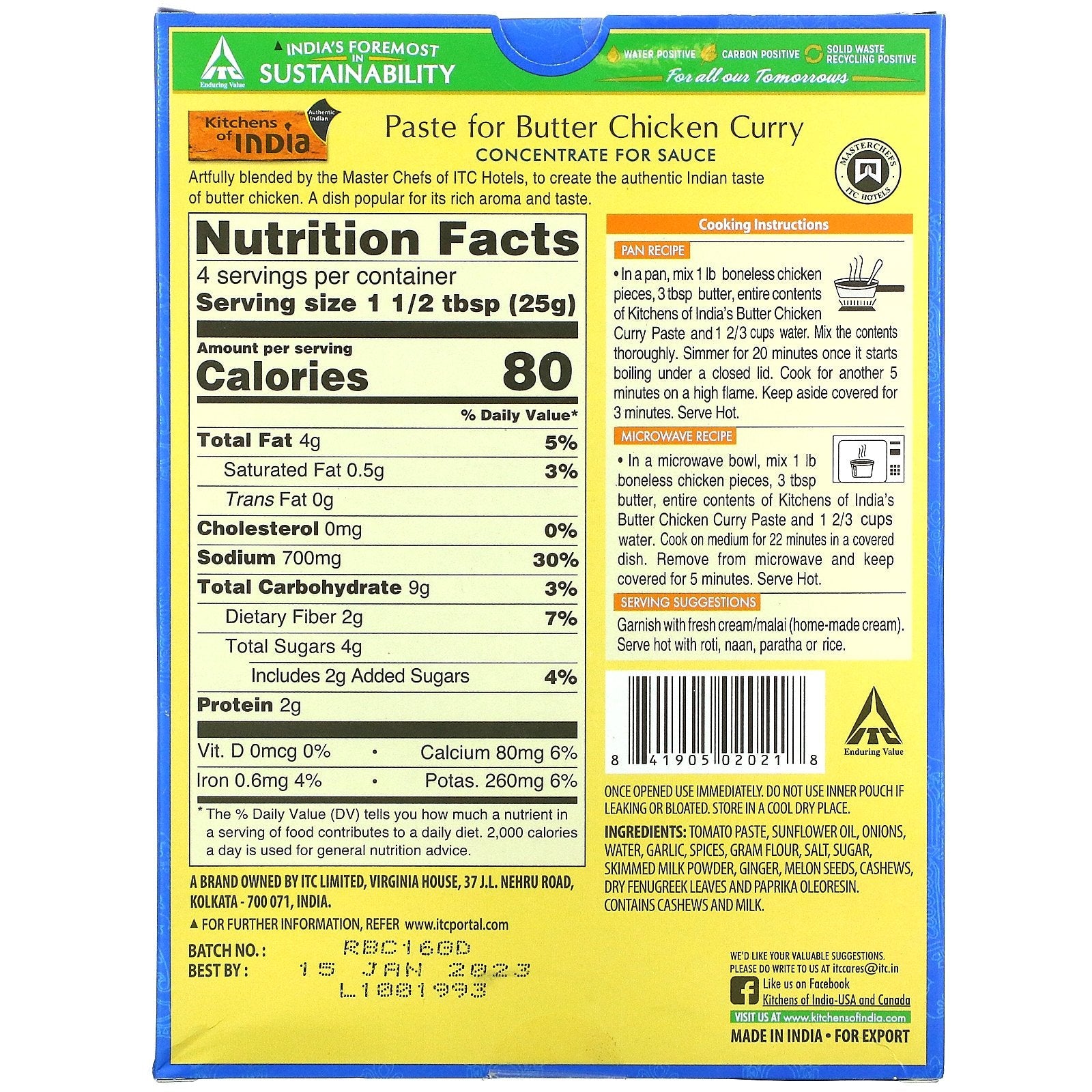 Cooking Instructions Pan Recipe In a pan, mix 1 lb boneless chicken pieces, 3 tbsp butter, entire contents of Kitchens of India's Butter Chicken Curry Paste and 1 2/3 cups water. Mix the contents thoroughly. Simmer for 20 minutes once it starts boiling under a closed lid. Cook for another 5 minutes on a high flame. Keep aside covered for 3 minutes. Serve Hot. Microwave Recipe In a microwave bowl, mix 1 lb boneless chicken pieces, 3 tbsp butter, entire contents of Kitchens of India's Butter Chicken Curry Paste and 1 2/3 cups water. Cook on medium for 22 minutes in a covered dish. Remove from microwave and keep covered for 5 minutes. Serve Hot. Serving Suggestions Garnish with fresh cream/malai (home-made cream). Serve hot with roti, naan, paratha or steamed rice.Other Ingredients