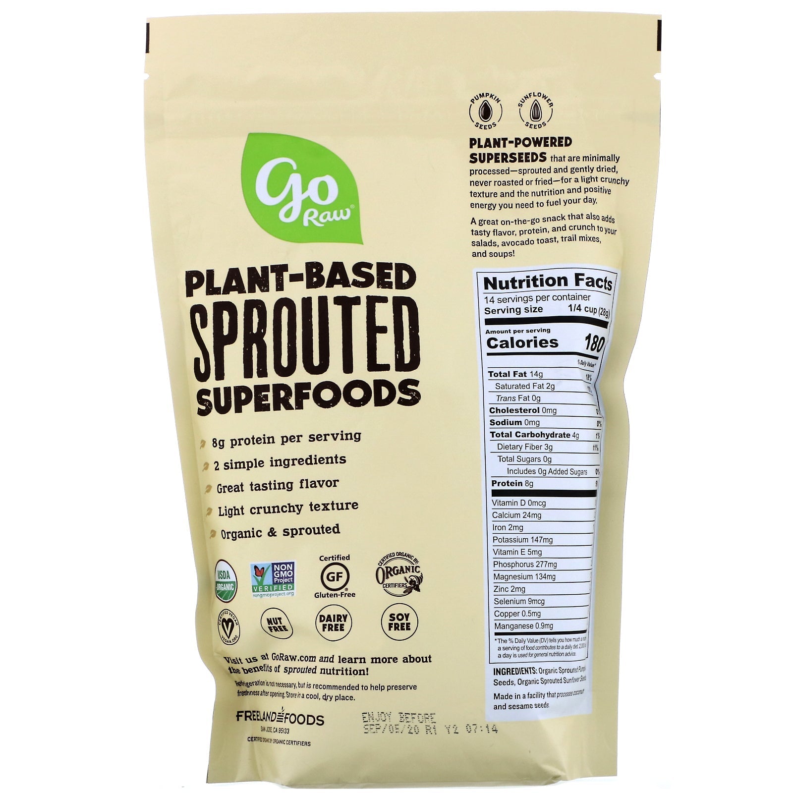 8 g Protein Per Serving Just 2 Ingredients USDA Non GMO Project Verified Pumpkin Seeds Sunflower Seeds Certified Gluten-Free Certified by Certifiers Certified Vegan Nut Free Dairy Free Soy Free Plant-Powered Superseeds that are minimally processed-sprouted and gently dried, never roasted or fried- for a light crunchy texture and the nutrition and positive energy you need to fuel your day. Plant-Based Sprouted Superfoods Great tasting flavor Light crunchy texture & sproutedSugg. UseA great on-the-go snack that also adds tasty flavor, protein, and crunch to your salads, avocado, toast, trail mixes, and soups! Refrigeration is not necessary, but is recommended to help preserve freshness after opening.Other Ingredients sprouted pumpkin seeds, sprouted sunflower seeds. Made in a facility that processes coconut and sesame seeds.Supplement FactsServing Size: ¼ Cup (28 g) Servings Per Container: 14 Amount Per Serving %Daily Value* Calories 180 Total Fat 14 g 18% Saturated Fat 2 g 10% Trans...