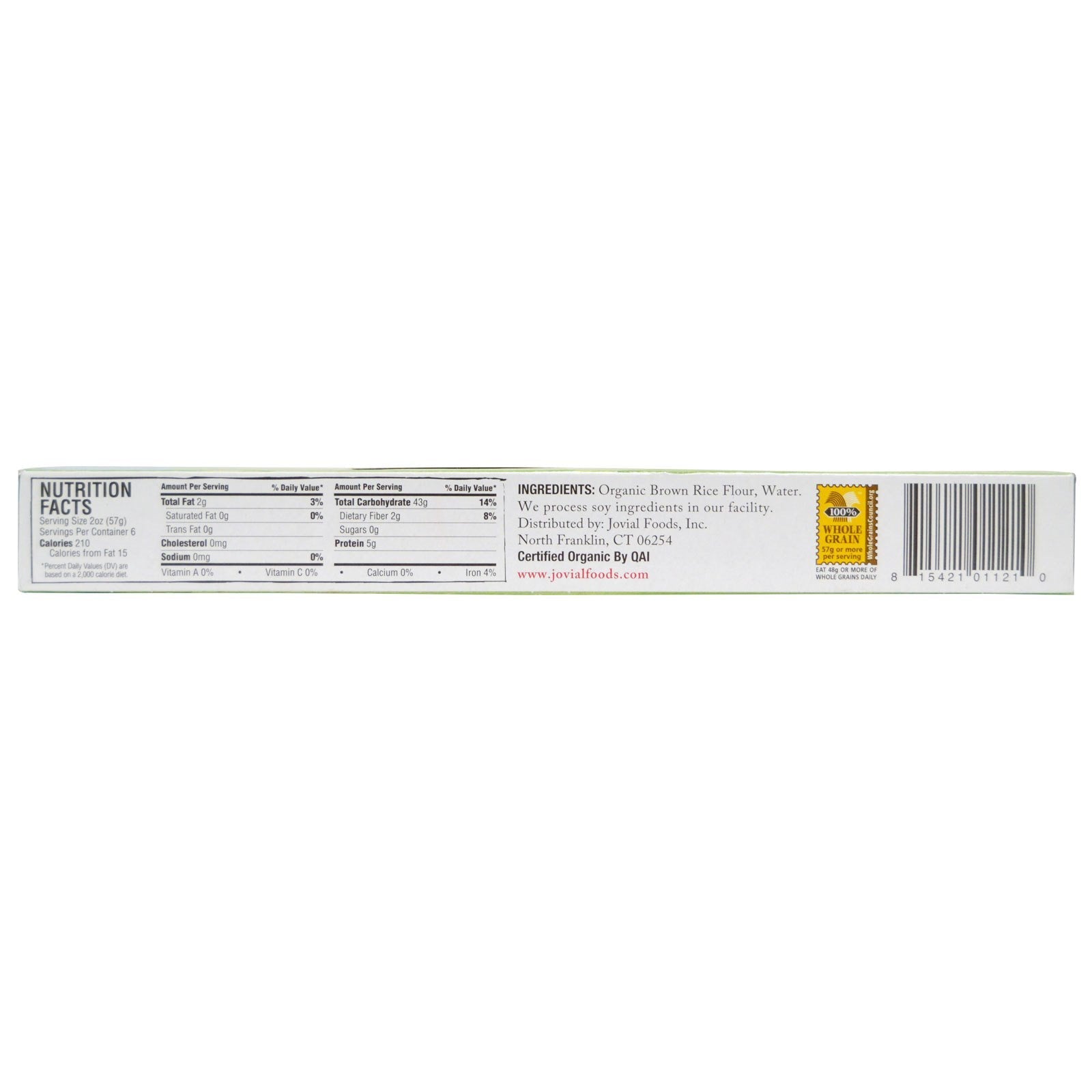 Award Winning Taste & Texture 44+ Years Our Pasta Artisans have been Crafting Gluten Free Pasta Since 1970 Inherently Good Certified Gluten Free 100% Organic Whole Grain USDA Organic Kosher Certified Organic by QAI 100% Whole Grain 57 g or More Per Serving Eat 48 g or More of Whole Grains Daily This is real pasta. Authentic, artisan crafted, traditional pasta from Tuscany that is worry free in every way. Made in a dedicated facility free of gluten, milk, eggs, tree nuts and peanuts, Jovial pasta is made with only one wholesome ingredient - 100% organic whole grain rice grown exclusively in Italy. This is delicious pasta for everyone. Jovial products are made by people just like you. We care, from seed to shelf.Sugg. UseOther IngredientsOrganic brown rice flour, water. We process soy ingredients in our facility.Supplement FactsServing Size: 2 oz (57 g) Servings Per Container: 6 Amount Per Serving...