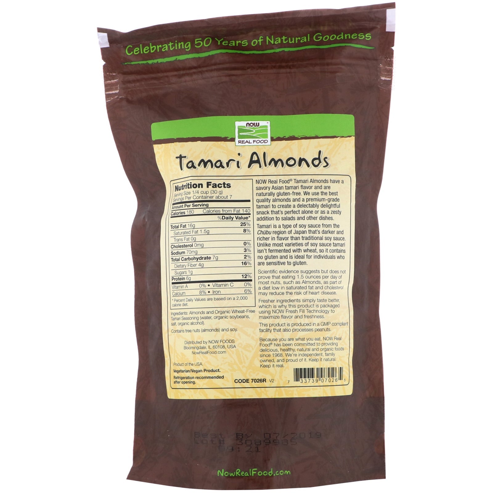 Celebrating 50 Years of Natural Goodness Savory Asian Tamari Flavor Irresistibly Delicious Gluten Free Flavor Sensations Always Real Always Non-GMO Vegetarian/Vegan Product Now Real Food® Tamari Almonds have a savory Asian tamari flavor and are naturally gluten-free. We use the best quality almonds and a premium-grade tamari to create a delectably delightful snack that's perfect alone or as a zesty addition to salads and other dishes. Tamari is a type of soy sauce from the Chubu region of Japan that's darker and richer in flavor than traditional soy sauce. Unlike most varieties of soy sauce tamari isn't fermented with wheat, so it contains no gluten and is ideal for individuals who are sensitive to gluten. Scientific evidence suggests but does not prove that eating 1.5 ounces per day of most nuts, such as Almonds, as part of a diet low in saturated fat and cholesterol may reduce the risk of heart disease. Fresher ingredients simply taste better which is why this product is packaged using NOW Fresh Fill Technology to maximize flavor and freshness. Because you are what you eat, NOW Real Food has been committed to providing delicious, healthy, natural and organic foods since 1968. We're independent, family owned, and proud of it. Keep it natural. Keep it real.