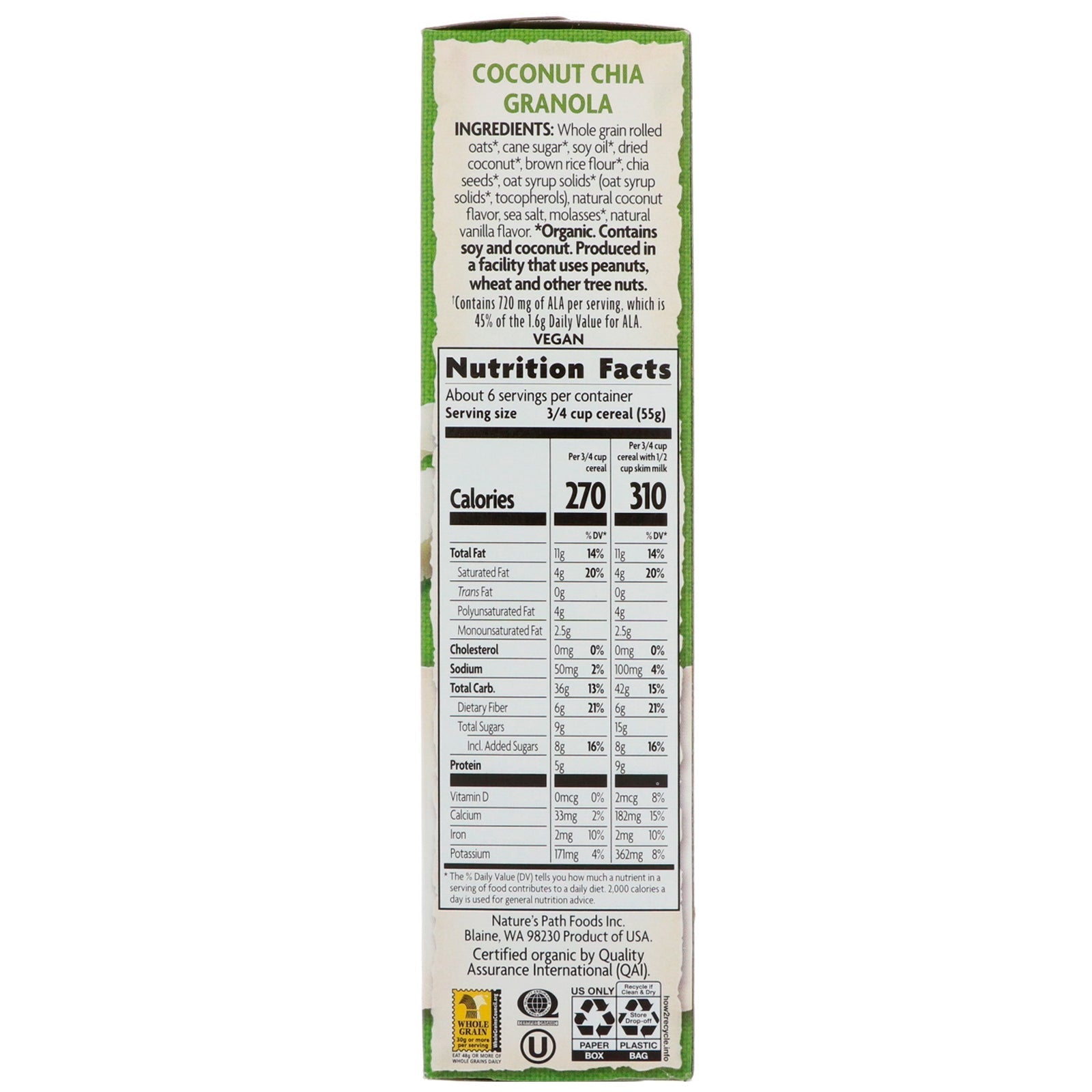 Always 6 g Fiber Per Serving 9 g Protein per Serving With Milk‡ USDA Non GMO Project Verified Excellent Source of ALA Omega-3† Vegan Certified by Quality Assurance International (QAI) Whole Grain 30 g or More Per Serving Eat 48 g or More of Whole Grains Daily Kosher Delicious Goodness ALA Omega-3-Rich Chia Seeds Fiber-Rich Coconut Flakes Fill your bowl with Coconut Chia Granola for a wholesome breakfast to nourish your day. With deliciously crunchy cluster of oats, nutrient-dense coconut and fiber-rich chia seeds, it'll put you on a better path to a healthier lifestyle. An Legacy "Our always promise goes back to the family farm I was raised on -well before the 'industry' began. In 1985, my wife Ratana and I founded Nature's Path Foods based on my dad's advice to 'Always leave the soil better than you found it', by farming without chemical pesticides, fertilizers or GMOs. For over 30 years, our family has aspired to make delicious foods and an enduring independent company that you can love and trust". Arron From our family to yours, Arran Stephens, Co-founder Our Promise The Certified seal on this package guarantees these ingredients have been grown in harmony with nature, reducing exposure to toxic synthetic chemicals and genetically modified seeds. It's been a promise from our family to yours for over 30 years. Non-GMO No genetic engineering has been used at any stage in growing the ingredients or in making this granola. At Nature's Path, we're committed to feeding you only , non-GMO ingredients. It's the better choice for our bodies and for the planet. ‡Prepared with ½ cup skim milk †Contains 720 mg of ALA per serving, which is 45% of the 1.6 Daily Value for ALA.