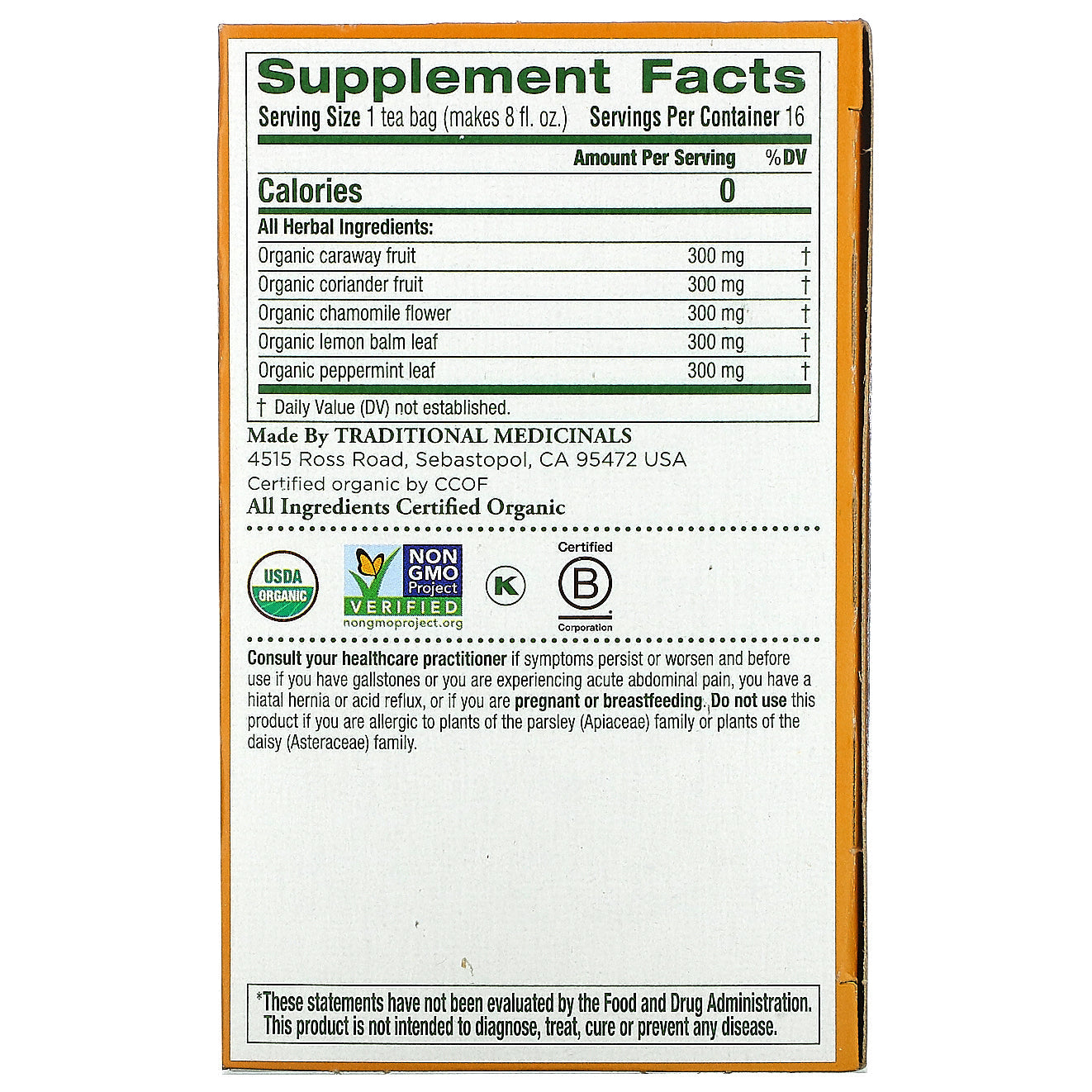 Digestive Wellness Relieves Gas & Bloating Herbal Supplement USDA Certified by CCOF Non GMO Project Verified Kosher Certified B Corporation Herbal Power Relieves gas and bloating. Taste Aromatic and minty with subtle, spiced notes. Plant Story This traditional formula is an herbal powerhouse of gas-relieving herbs, called carminatives, that have worked to support digestion for thousands of years. Equal parts of caraway, coriander, lemon balm, chamomile and peppermint combine to make this time-tested blend a cup of soothing relief. Herbs That Work From field to cup, we make sure our teas deliver the benefits of these amazing plants. To deliver consistent high quality teas, we source ally farmed or ally wild-collected herbs from ethical trading partnerships, seeking out medicinal-grade plants. Only a small fraction of the world's herb supply meets our high quality standards.Sugg. UseTo Enjoy Pour 8 oz. freshly boiled water over 1 tea bag. Cover & steep for...