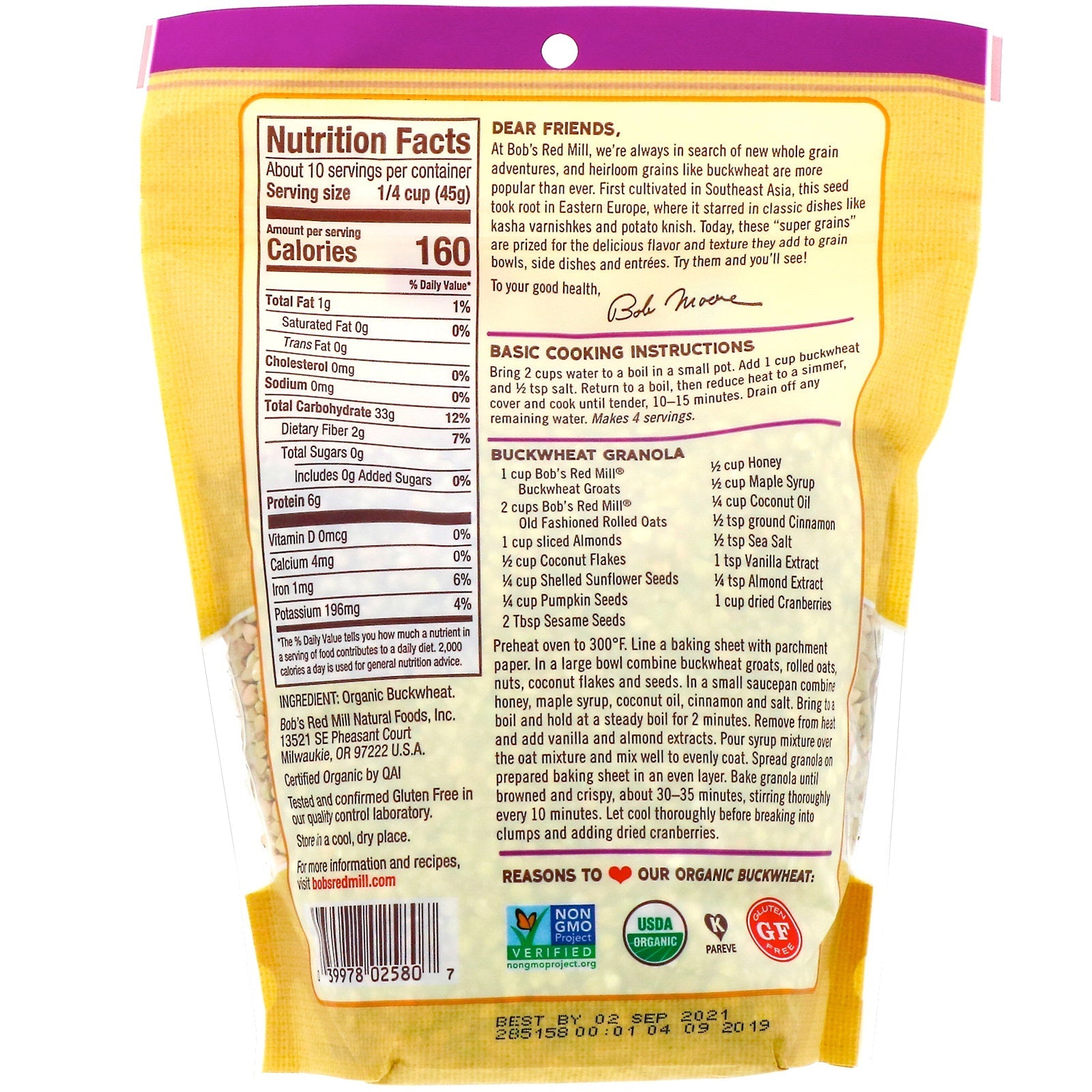 An Employee-Owned Company USDA Grains-of-Discovery Gluten Free Non GMO Project Verified Circa | 6000 B.C The Traditional Grain of Eastern Europe Mainstay of Eastern European Cuisine With a Robust Flavor Great In Grain Bowls, Soups and Cereal Quick Cooking and Gluten Free Certified by QAI Dear Friends, At Bob's Red Mill, we're always in search of new whole grain adventures, and heirloom grains like buckwheat are more popular than ever. First cultivated in Southeast Asia, this seed took root in Eastern Europe, where it starred in classic dishes like kasha varnishkes and potato knish. Today, these 'super grains" are prized for the delicious flavor and texture they add to grain bowls, side dishes and entrees. Try them and you'll see! To your good health, Bob Moore Reasons to Love Our Buckwheat: Kosher PareveSugg. UseOther Ingredients buckwheat. Tested and confirmed gluten free in our quality control laboratory.Supplement FactsServing Size: 1/4 cup...