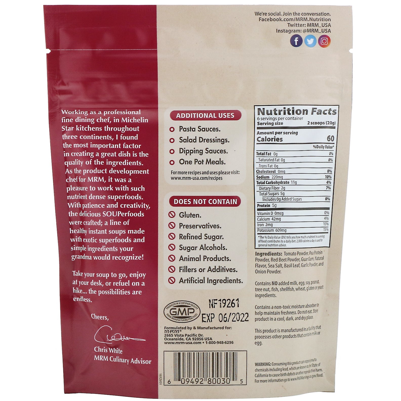 Eco Friendly Packaging Non GMO Project Verified Certified Vegan Gluten Free Produced in a Certified Facility GMP- Good Manufacturing Practices What's Inside: Tomato Powder Red Beet Powder Basil Leaf Garlic Powder Onion Powder Working as a professional fine dining chef, in Michelin Star kitchens throughout three continents, I found the most important factor in creating a great dish is the quality of the ingredients. As the product development chef for MRM, it was a pleasure to work with such nutrient dense superfoods. With patience and creativity, the delicious SOUPerfoods were crafted; a line of healthy instant soups made with exotic superfoods and simple ingredients your grandma would recognize! Take your soup to go, enjoy at your desk, or refuel on a hike...the possibilities are endless. Cheers, Chris White - MRM Culinary Advisor