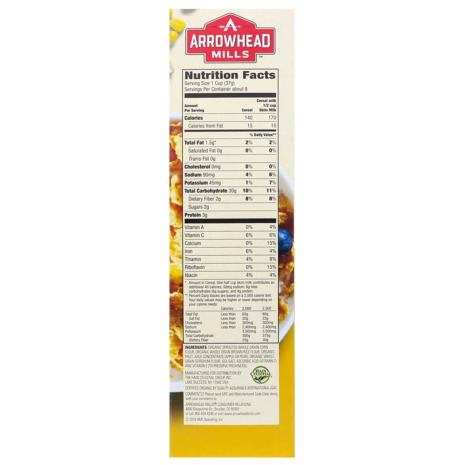USDA Certified Gluten Free Kosher Parve Low Fat 32 Grams per Serving Eat 48 g or More of Whole Grains Daily Certified by the Quality Assurance International (QAI) It's Simple: No Short-Cuts, Just Great Tasting Flakes and 32 g Whole Grains Per Serving We blend the , whole grain ingredients from Sprouted Corn, Brown Rice and Sorghum. Sprouted grains like corn may enhance the bioavailability of nutrients found in the grain. Arrowhead Mills brand was born in the Texas Panhandle back in 1960. We've grown, but we haven't changed how we do things. We're still using our same trusted milling process and building long-term relationships with our growers, working with them face-to-face, day-to-day. Hard work, honesty, kindness, and business with a handshake-that's our process. That's the Arrowhead Mills way. It's how we bring the awesome goodness of the land to your table, and we're real proud of it. Sprouted Corn...