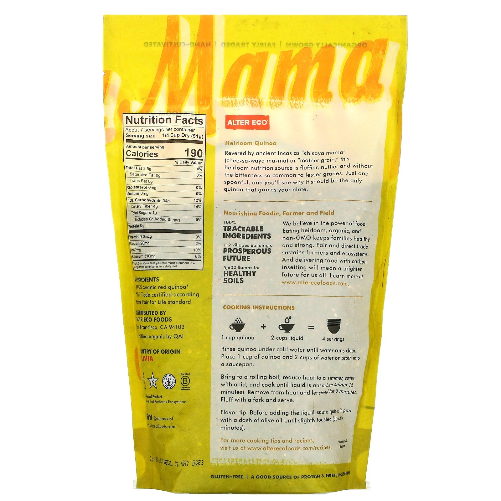 Organically Grown | Fairly Traded | Hand-Cultivated Heirloom Variety Taste the Difference Alter Ego Nutty, Flavorful Supergrain of the Andes A Good Source of Protein & Fiber USDA Organic Fair for Life - Fair Trade Certified Organic by QAI Certified Gluten-Free Kosher Carbon Neutral Product Certified B Corporation Whole Grain Heirloom Quinoa Revered by ancient Incas as "chisaya mama" (chee-sa-waya-ma-ma) or "mother grain", this heirloom nutrition source is fluffier, nuttier and without the bitterness so common to lesser grades. Just one spoonful, and you'll see why it should be the only quinoa that graces your plate. Nourishing Foodie, Farmer and Field 100% traceable Ingredients 112 villages building a prosperous future 5,600 llamas for healthy soils We believe in the power of food. Eating heirloom, organic, and non-GMO keeps families healthy and strong. Fair and direct trade sustains farmers and ecosystems. And delivering food with carbon insetting will mean a brighter future for us all.