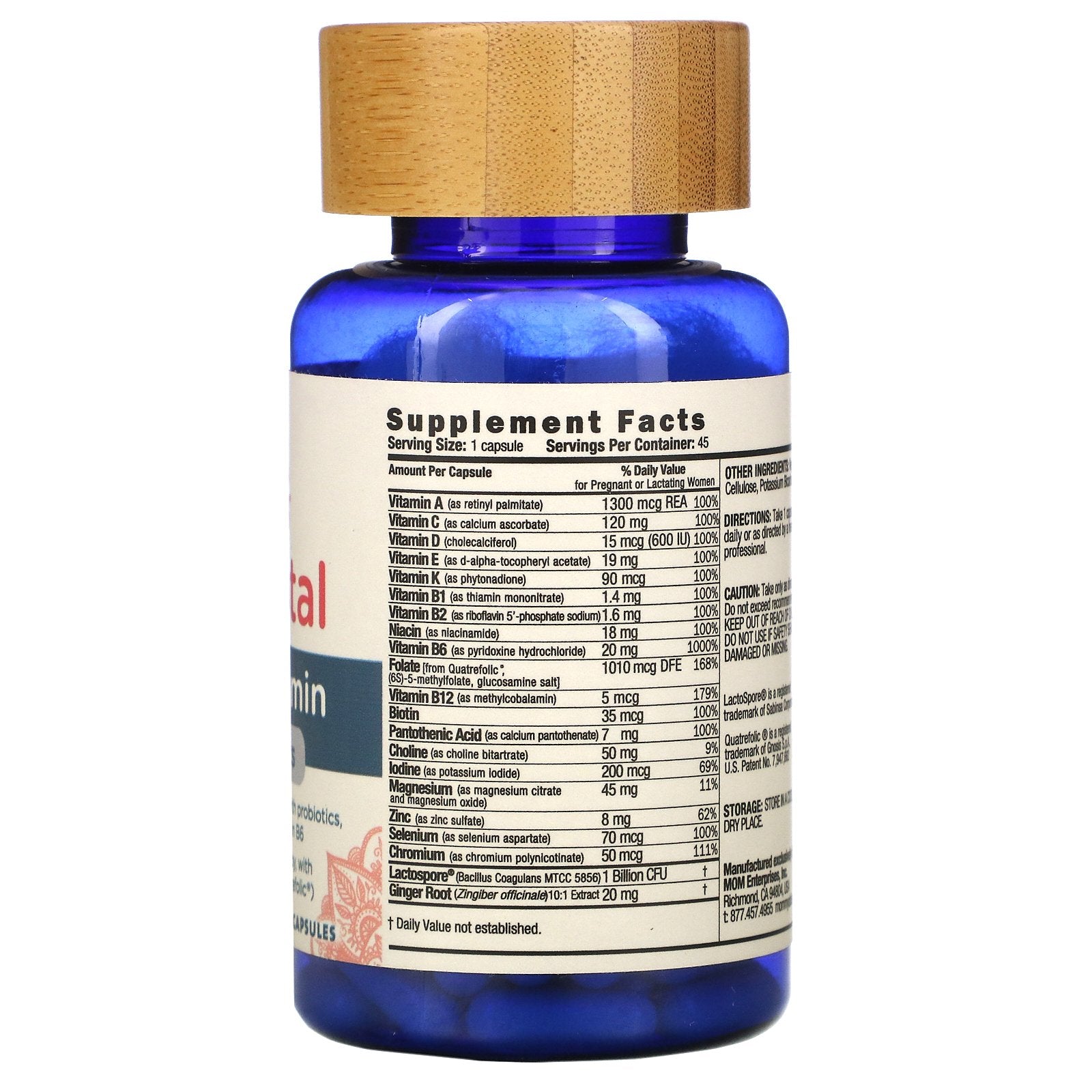 Serving Size : 1 capsule Servings Per Container: 45 Amount Per Serving %Daily Value for pregnant or lactating women* Vitamin A (as retinyl palmitate) 1300 mcg REA 100% Vitamin C (as calcium ascorbate) 120 mg 100% Vitamin D (cholecalciferol) 15 mcg (600 IU) 100% Vitamin E (as d-alpha-tocopheryl acetate) 19 mg 100% Vitamin K (as phytonadione) 90 mcg 100% Vitamin B1 (as thiamin mononitrate) 1.4 mg 100% Vitamin B2 (as riboflavin 5'-phosphate sodium) 1.6 mg 100% Niacin (as niacinamide) 18 mg 100% Vitamin B6 (as pyridoxine hydrochloride) 20 mg 100% Folate (from Quatrefolic ®, (6S)-5-methylfolate, glucosamine salt) 1010 mcg DFE 168% Vitamin B12 (as methylcobalamin) 5 mcg 179% Biotin 35 mcg 100% Pantothenic Acid (as calcium pantothenate) 7 mg 100% Choline (as choline bitartrate) 50 mg 9% Iodine (as potassium iodide) 200 mcg 69% Magnesium (as magnesium citrate and magnesium iodide) 45 mg 11% Zinc (as zinc sulfate) 8 mg 62% Selenium (as selenium aspartate) 70 mcg 100% Chromium (as chromium polynicotinate) 50 mcg 111% Lactospore ® (Bacillus Coagulans MTCC 5856) 1 Billion CFU † Ginger Root (Zingiber officinalis 10:1 Extract 20 mg † †Daily Values not established.Disclaimer