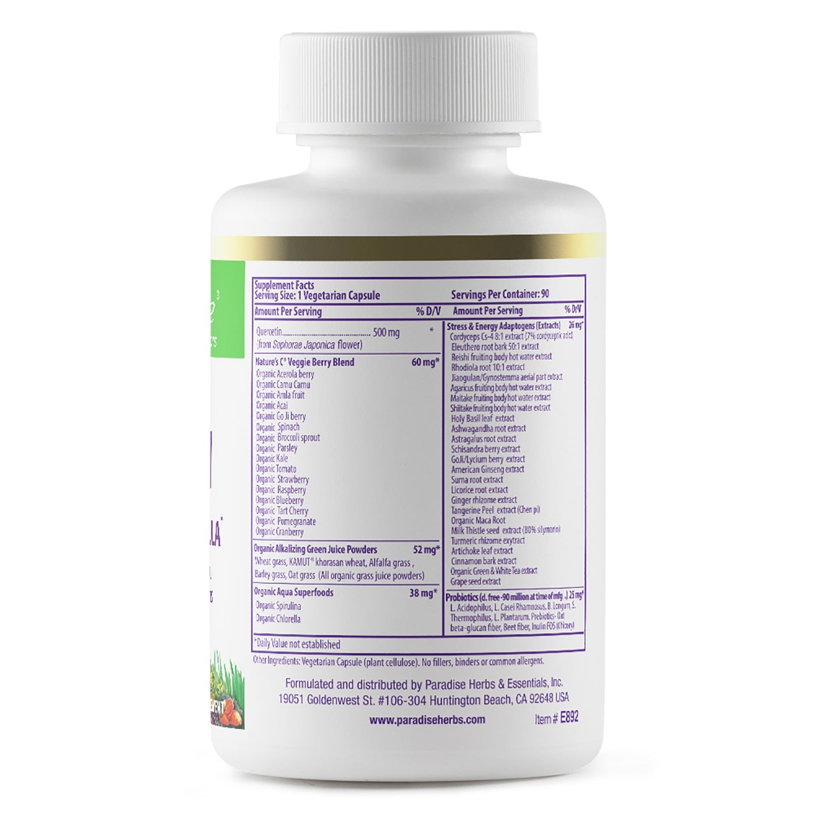 Serving Size: 1 Vegetarian Capsule Servings Per Container: 90 Amount Per Serving % DV Quercetin (from Sophorae Japonica flower) 500 mg * Nature's C® Veggie Berry Blend Organic Acerola berry Organic Camu Camu Organic Amla fruit Organic Acai Organic Go Ji berry Organic Spinach Organic Broccoli sprout Organic Parsley Organic Kale Organic Tomato Organic Strawberry Organic Raspberry Organic Blueberry Organic Tart Cherry Organic Pomegranate Organic Cranberry 60 mg * Organic Alkalizing Green Juice Powders Wheat grass, Kamut Khorasan Wheat, Alfalfa grass, Barley grass, Oat grass (All organic grass juice powders) 52 mg * Organic Aqua Superfoods Organic Spirulina Organic Chlorella 38 mg * Stress & Energy Adaptogens (Extract) Cordyceps CS-4 8:1 extract (7% cordyceptic acid) Eleuthero root bark 50:1 extract Reishi fruiting body hot water extract Rhodiola root 10:1 extract Jiaogulan/Gynostemma aerial part extract Agaricus fruiting body hot water extract Maitake fruiting body hot water extract Shiitake fruiting body hot water extract Holy basil leaf extract Ashwagandha root extract Astragalus root extract Schisandra berry extract Goji/Lycium berry extract American Ginseng extract Suma root extract Licorice root extract Ginger rhizome extract Tangerine Peel extract (Chen pi) Organic Maca Root Milk Thistle seed extract (80% silymarin) Turmeric rhizome extract Artichoke leaf extract Cinnamon bark extract Organic Green & White Tea extract Grape seed extract 26 mg * Probiotics (d. free-90 million at time of mfg.) L. Acidophilus, L. Casei Rhamnosus, B. Longum, S. Thermophilus, L. Plantarum, Prebiotics-Oat beta-glucan fiber, Beet fiber, Inulin FOS (Chicory) 25 mg * *Daily Value not established.Disclaimer
