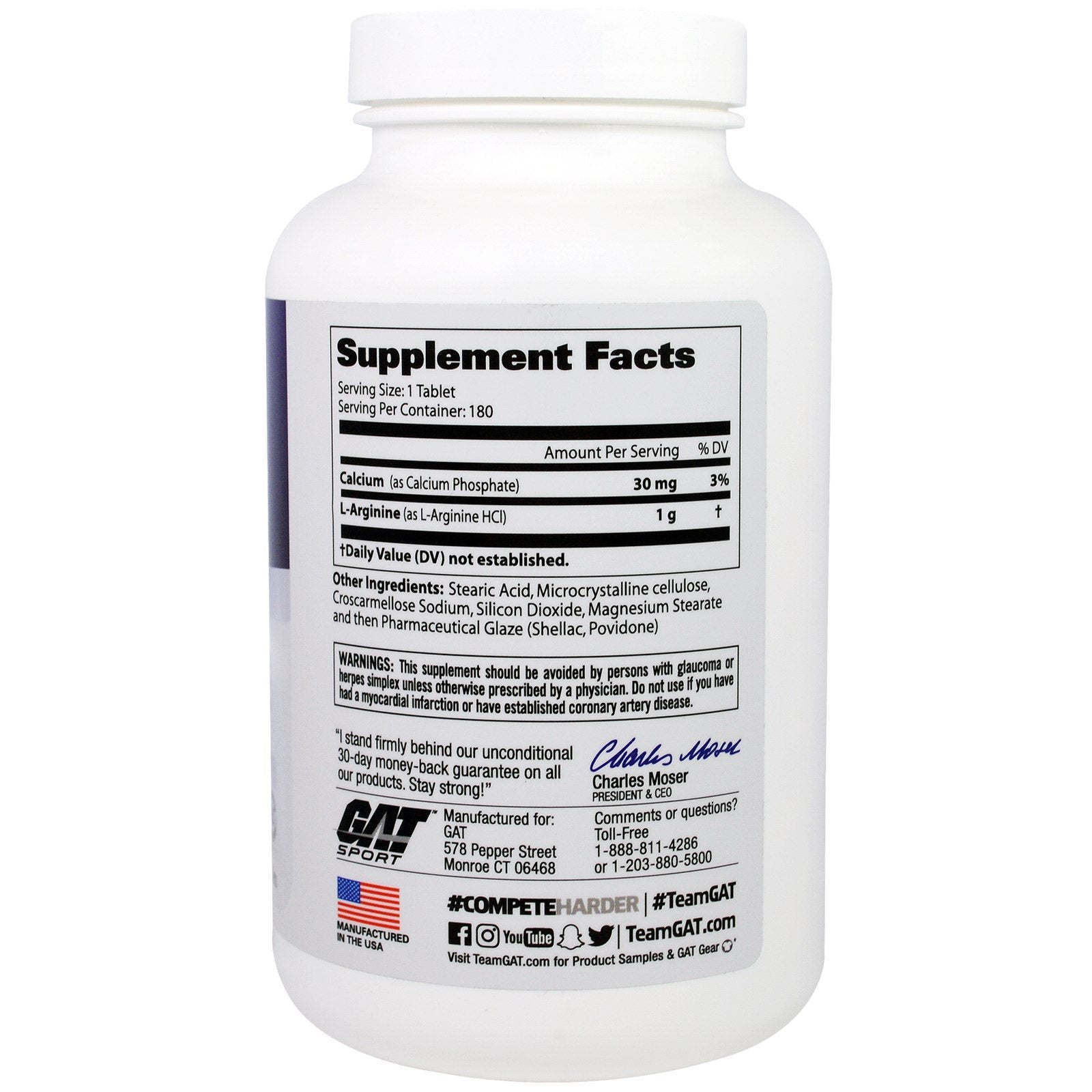 Free Form Amino Acid Essentials Conditionally Essential Amino Acid Increase Nitric Oxide Activity Dietary Supplement L-Arginine - Nitric Oxide Fuel L-Arginine is a conditionally essential basic amino acid and is a precursor for the production of Nitric Oxide. High performance athletes need as much blood flowing to their muscles as possible. L-Arginine may help improve blood flow and exercise capacity and is necessary for the production of creatine. That makes GAT L-Arginine an excellent bodybuilding supplement. Free form L-arginine for better absorption Fuels muscle pumps and blood flow Maximizes n.o. production/nutrient delivery Promotes performance Building block of proteinSugg. UseAs a dietary supplement, take one (1) tablet 2 times daily as needed. Take between meals or at bed-time with a carbohydrate drink to facilitate absorption.Other IngredientsStearic acid, microcrystalline cellulose, croscarmellose sodium, silicon dioxide, magnesium stearate and then pharmaceutical glaze (shellac, povidone).Supplement FactsServing Size: 1 Tablet Servings Per Container: 180 Amount Per...